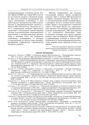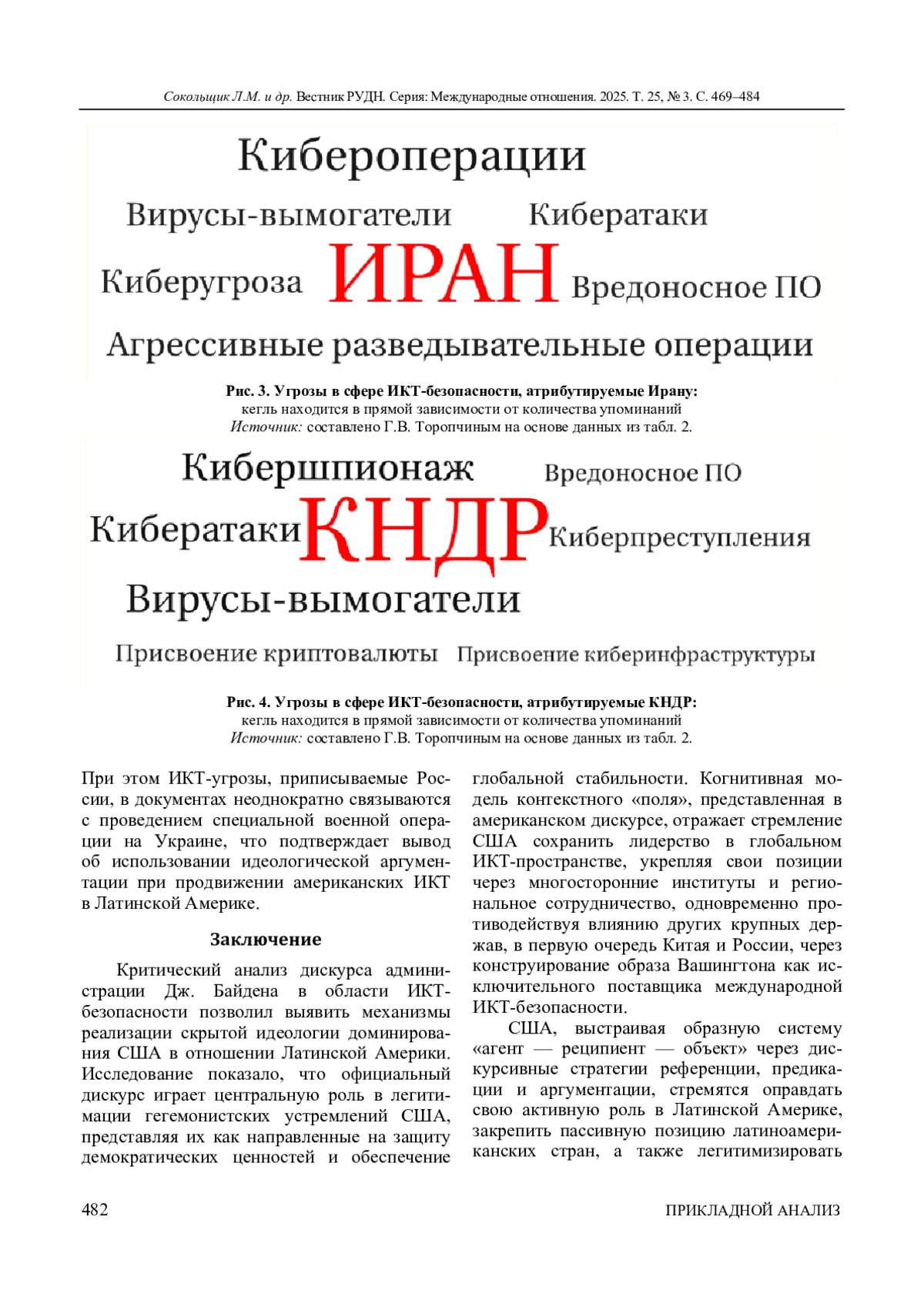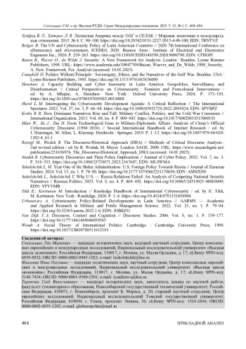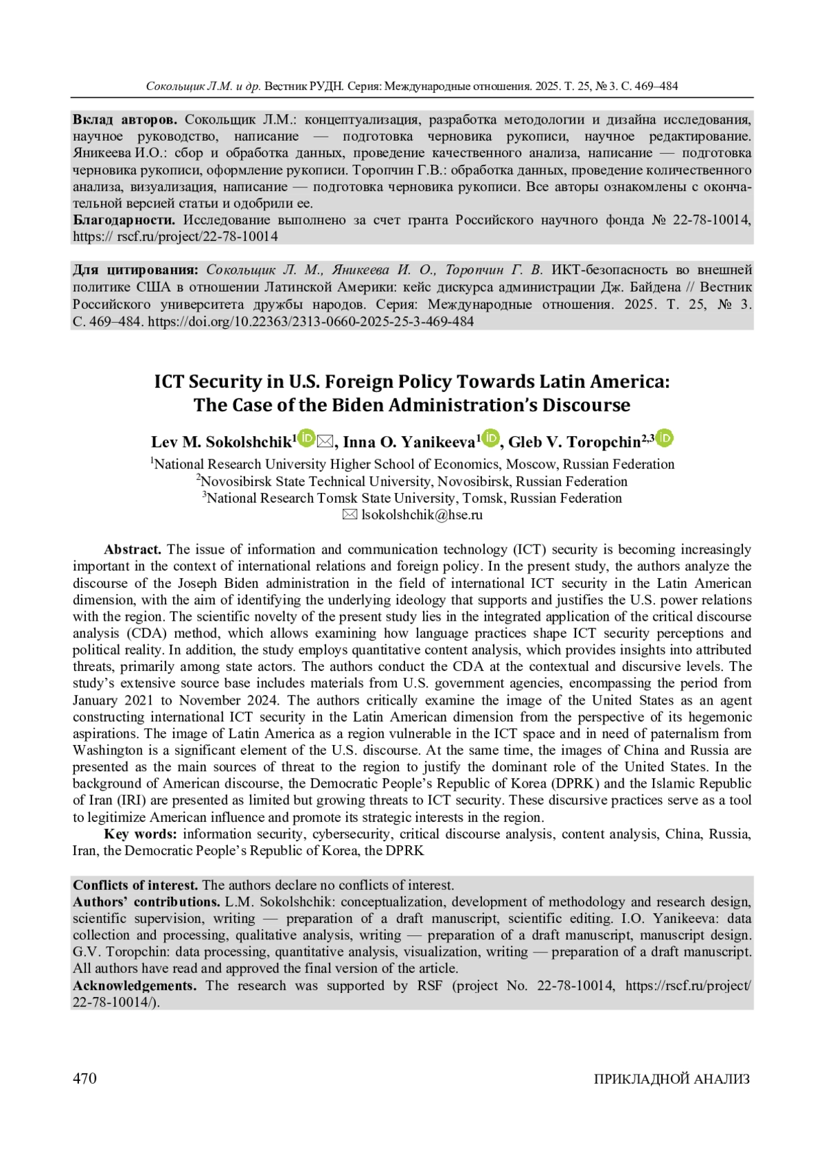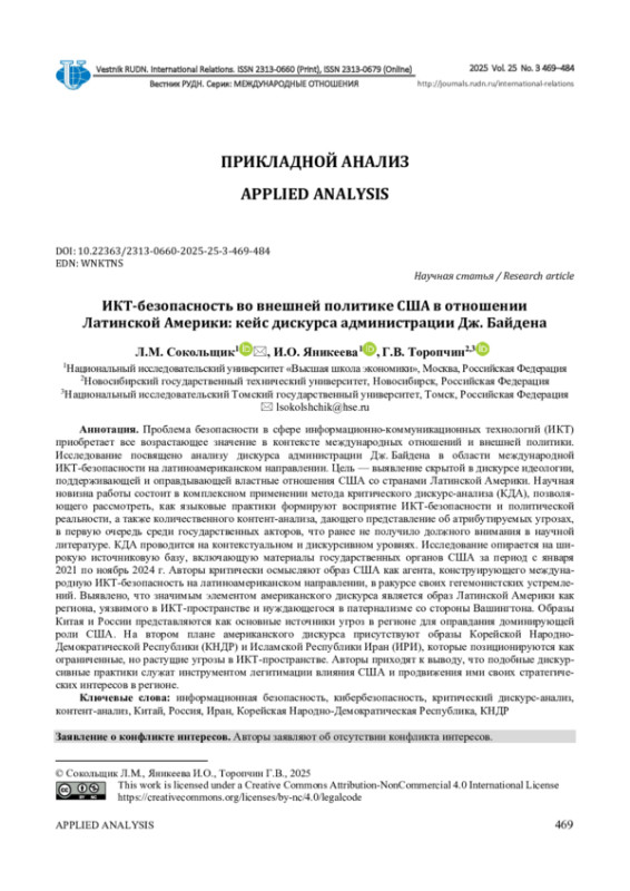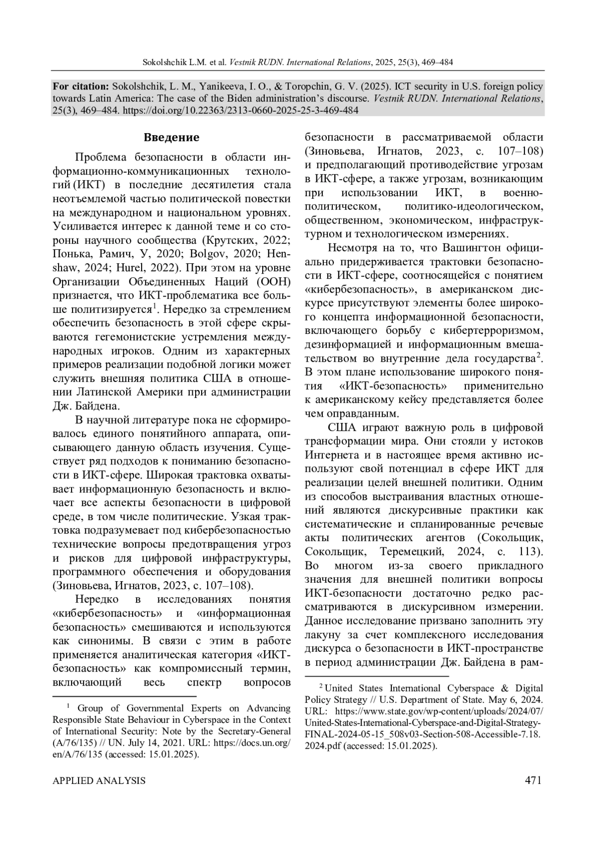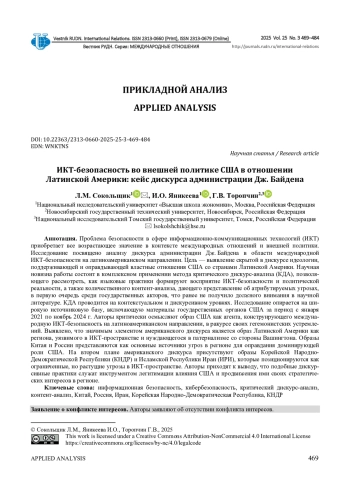 СОКОЛЬЩИК Л. М., ЯНИКЕЕВА И. О., ТОРОПЧИН Г. В. ИКТ-БЕЗОПАСНОСТЬ ВО ВНЕШНЕЙ ПОЛИТИКЕ США В ОТНОШЕНИИ ЛАТИНСКОЙ АМЕРИКИ: КЕЙС ДИСКУРСА АДМИНИСТРАЦИИ ДЖ. БАЙДЕНА // ВЕСТНИК РОССИЙСКОГО УНИВЕРСИТЕТА ДРУЖБЫ НАРОДОВ. СЕРИЯ: МЕЖДУНАРОДНЫЕ ОТНОШЕНИЯ. 2025. ТОМ 25 № 3