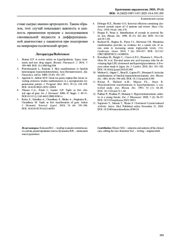 3. Agarwal S., Akhtar M.N. Great toe gouty tophus-like lesion revealing extensive tendon xanthomatosis in a asymptomatic hyperuricemic patient. J. Postgrad. Med. 2013; 59 (3): 238-239. DOI: 10.4103/0022-3859.118054