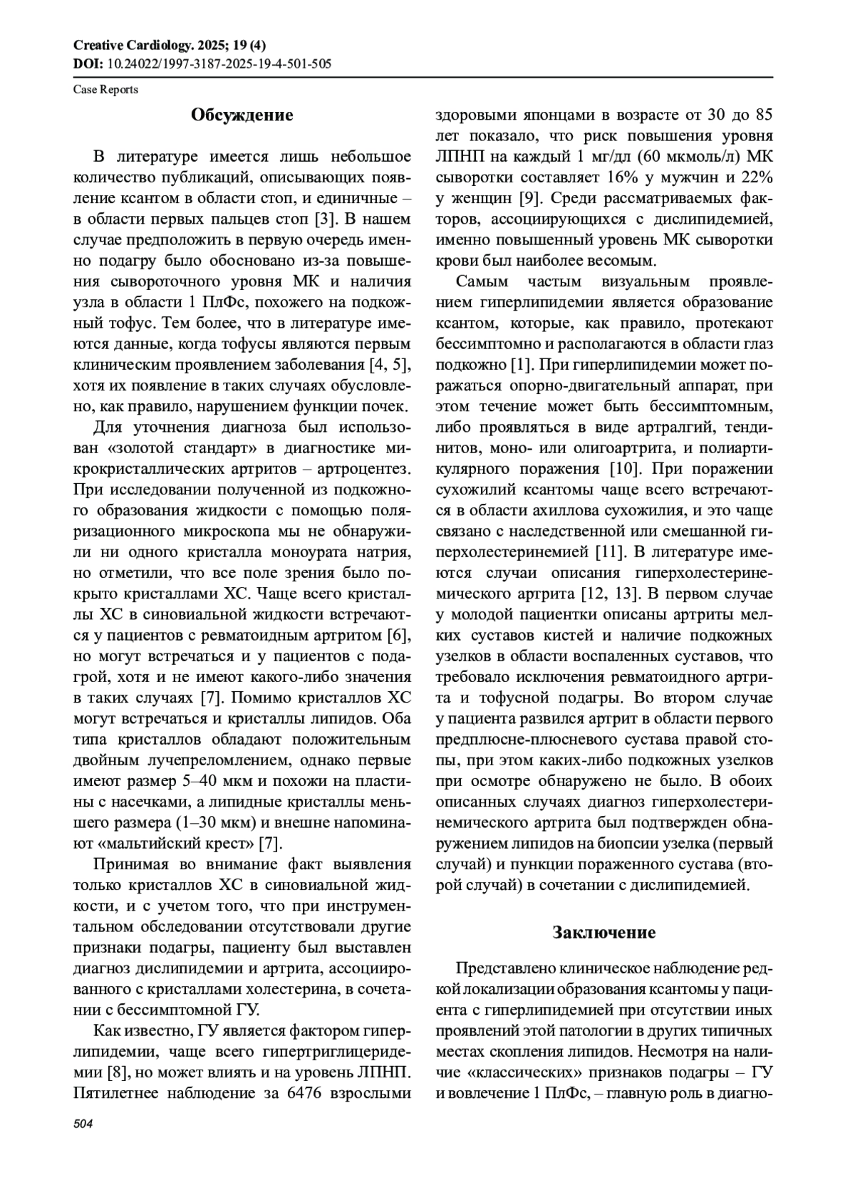 Поражение опорно-двигательного аппарата при гиперлипидемии встречается достаточно часто и протекает, как правило, бессимптомно. Однако внесуставная локализация кристаллов холестерина в области суставов стоп является редкой, особенно при отсутствии других ксантом в типичных местах. Еще реже встречается гиперхолестеринемический артрит. В нашей статье представлен случай нетипичного образования огромной ксантомы у пациента 49 лет в области I плюснефалангового сустава (ПлФс), что совпадало с клинической картиной тофуса при подагрическом артрите. В данном случае первостепенно требовалось исключение именно подагры, если принимать во внимание наличие в крови гиперурикемии и «классическое» вовлечение 1 ПлФс. Диагноз артрита, ассоциированного с отложениями кристаллов холестерина, в итоге был верифицирован с помощью «золотого стандарта» диагностики микрокристаллических артритов – артроцентеза.