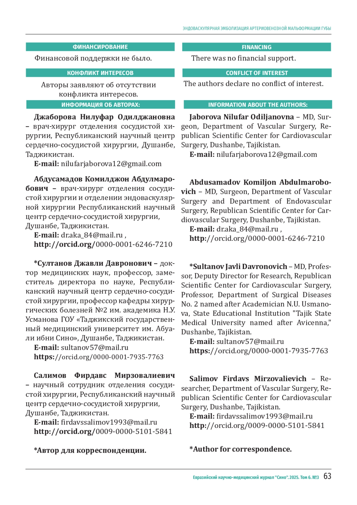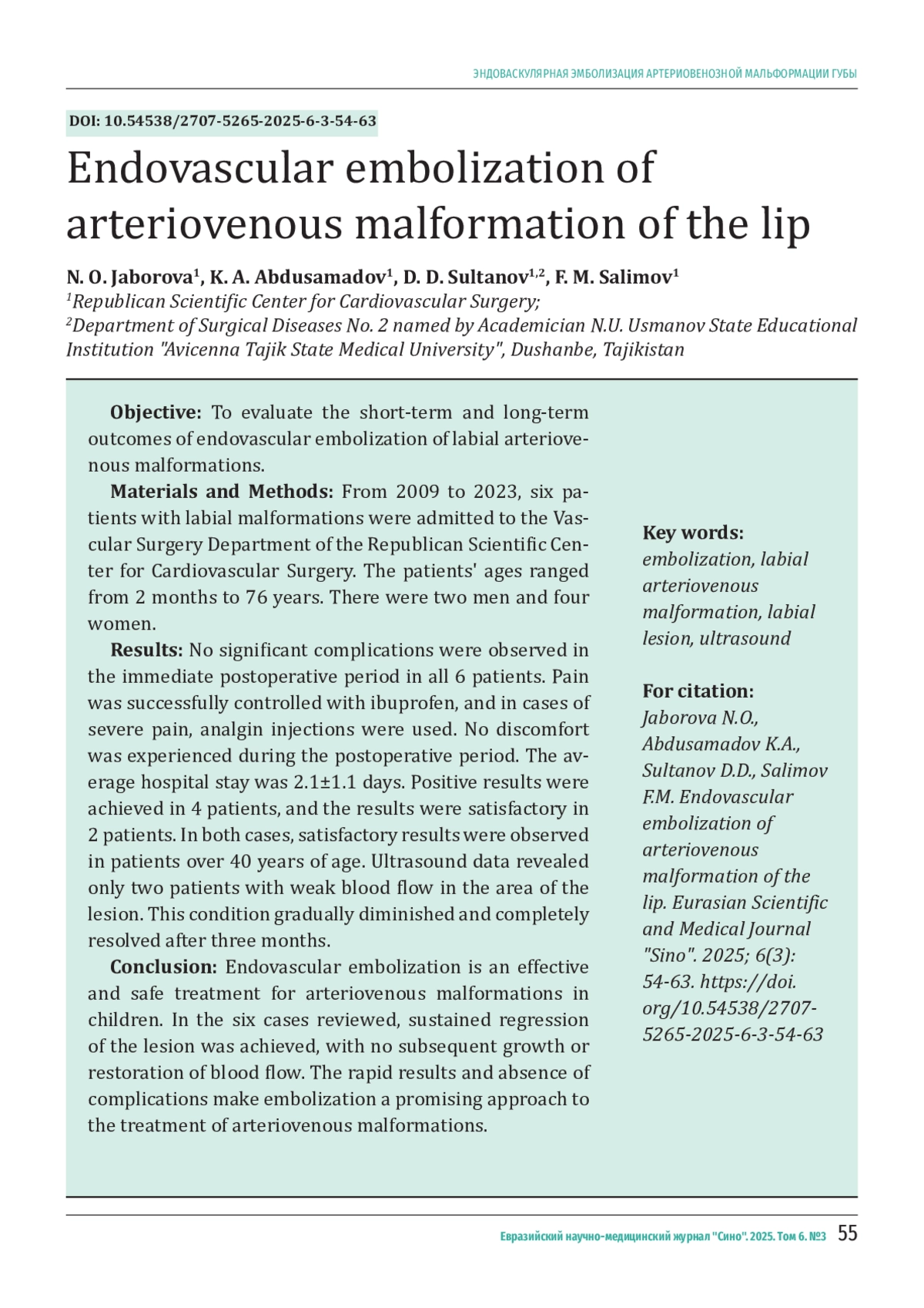4. Liu L., Wang Y., Yang N., Chen C., Wang S., Chen L., Xu H. Comprehensive Management of a Giant Venous Malformation of the Lip: Vascular Embolization Followed by Surgical Resection and Reconstruction. Ear, Nose & Throat Journal, 2023; 01455613231213477. DOI: 10.1177/01455613231213477