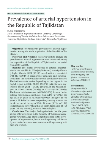 Заключение. Данные проведённого исследования констатируют о том, что в Республике Таджикистан распространённость артериальной гипертензии имеет региональные особенности. Возраст играет важную роль в развитии гипертонии, но не является основным фактором риска. С возрастом гипертония становится более распространённой как среди мужчин, так и среди женщин.