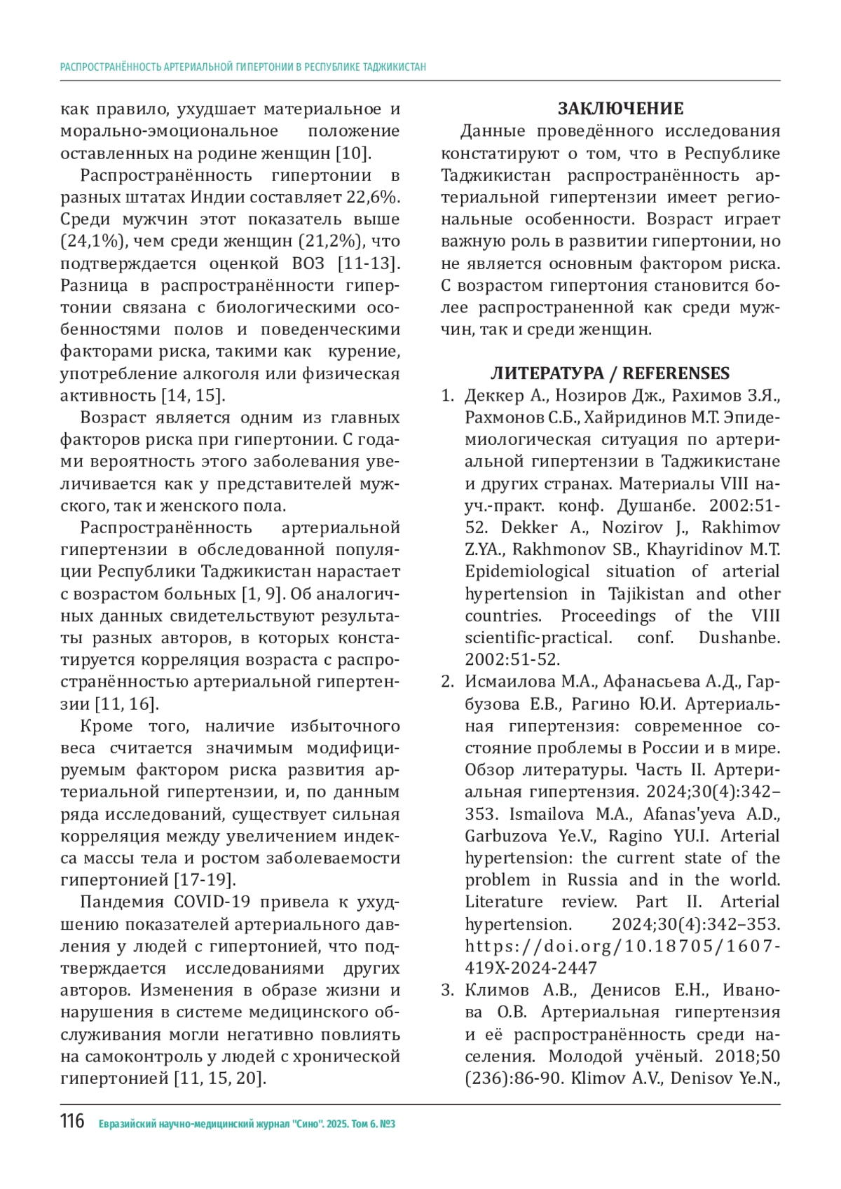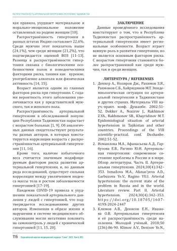 1. Деккер А., Нозиров Дж., Рахимов З.Я., Рахмонов С.Б., Хайридинов М.Т. Эпидемиологическая ситуация по артериальной гипертензии в Таджикистане и других странах. Материалы VIII науч.-практ. конф. Душанбе. 2002:51-52.