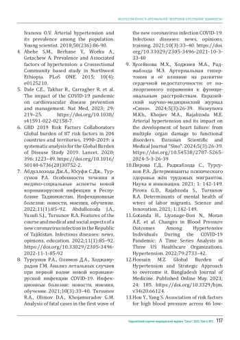7. Абдуллозода Дж.А., Юсуфи С.Дж., Турсунов Р.А. Особенности течения и медико-социальные аспекты новой коронавирусной инфекции в Республике Таджикистан. Инфекционные болезни: новости, мнения, обучение. 2022;11(1):85-92.