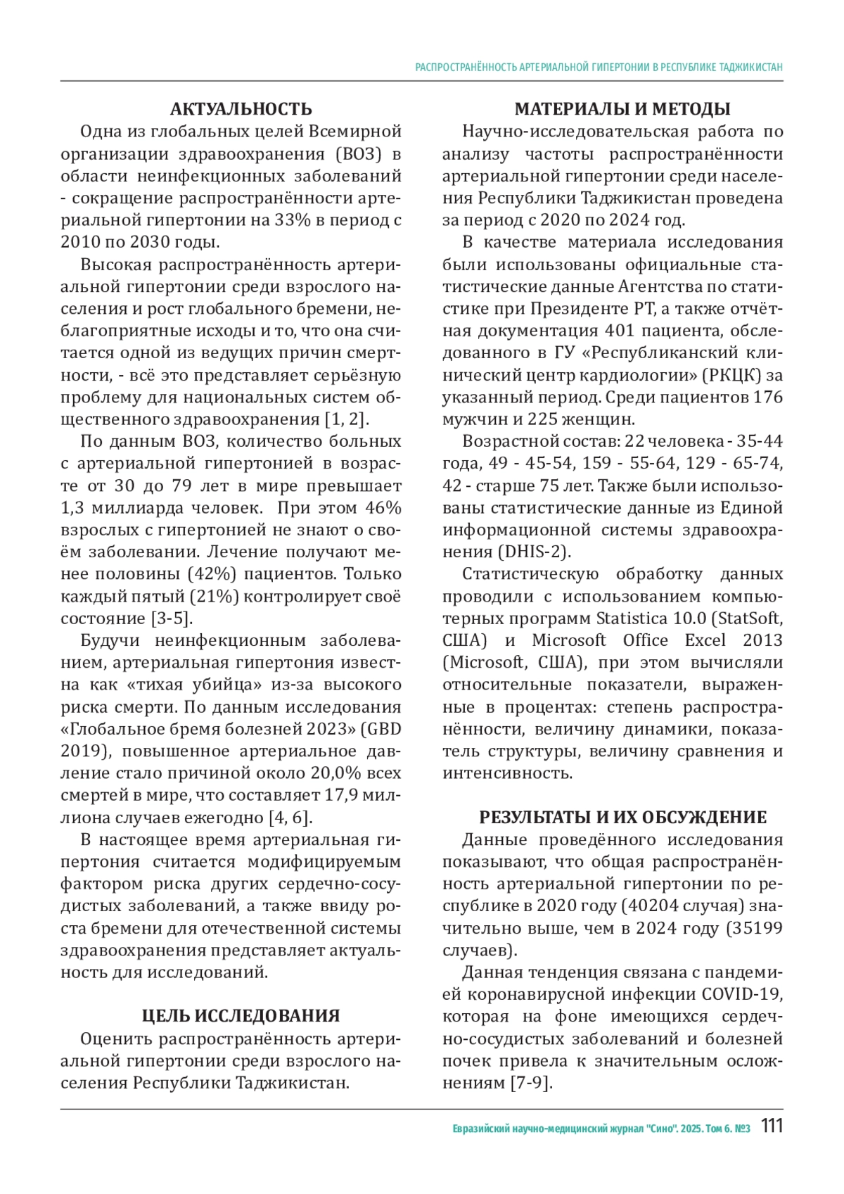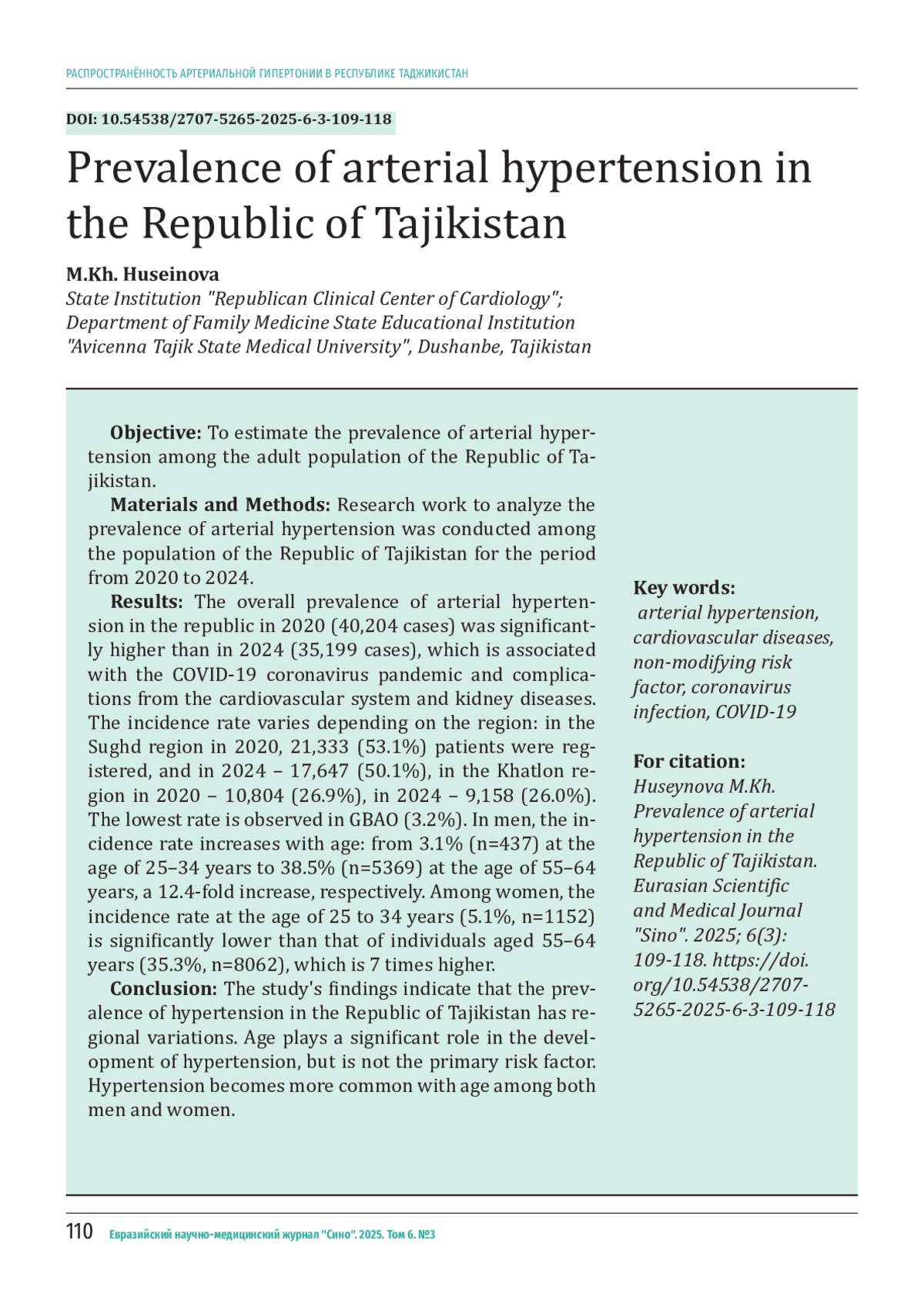 Материалы и методы. Научно-исследовательская работа по анализу частоты распространённости артериальной гипертонии проводилась среди населения Республики Таджикистан за период с 2020 по 2024 годы.