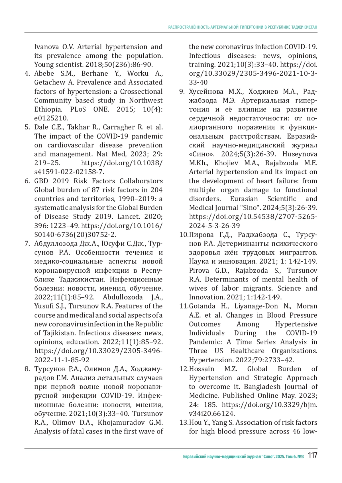 9. Хусейнова М.Х., Ходжиев М.А., Раджабзода М.Э. Артериальная гипертония и её влияние на развитие сердечной недостаточности: от полиорганного поражения к функциональным расстройствам. Евразийский научно-медицинский журнал “Сино”. 2024;5(3):26-39.