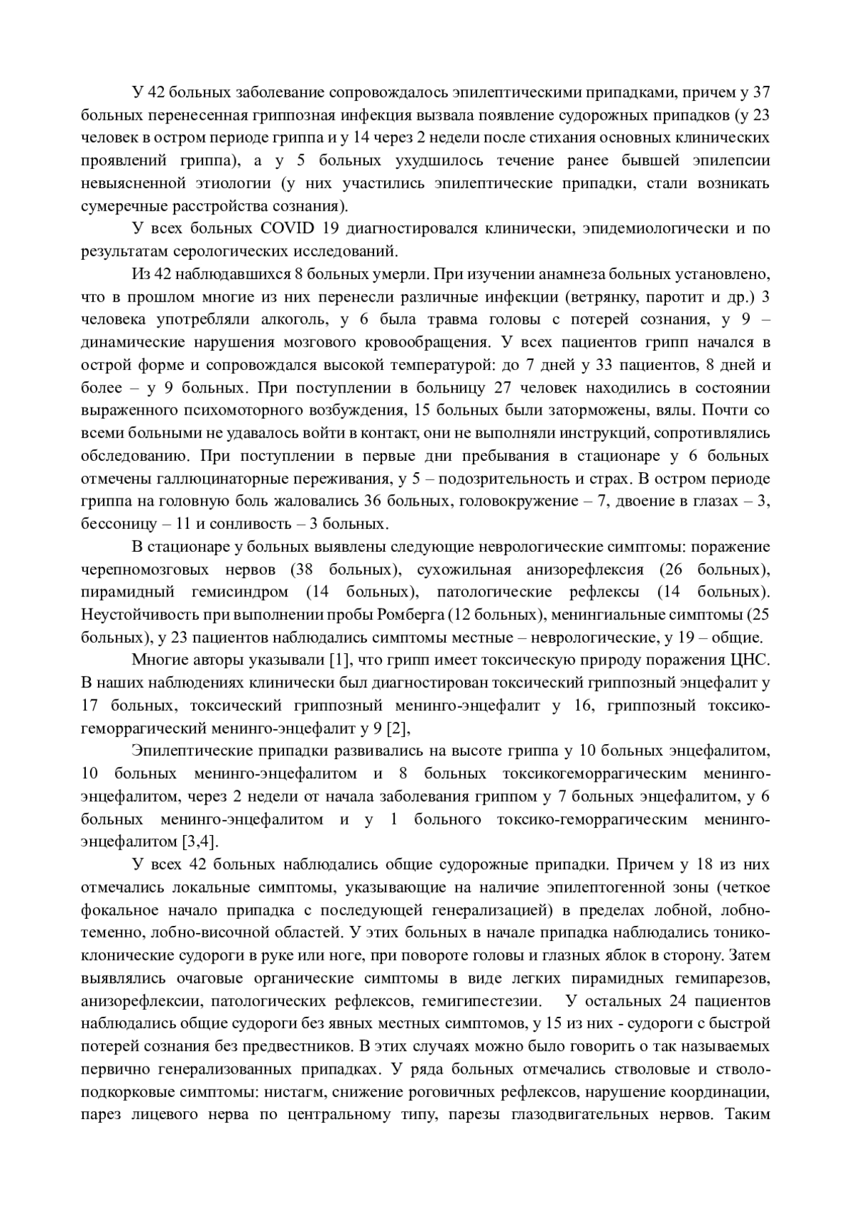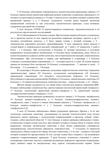Из 42 наблюдавшихся 8 больных умерли. При изучении анамнеза больных установлено, что в прошлом многие из них перенесли различные инфекции (ветрянку, паротит и др.) 3 человека употребляли алкоголь, у 6 была травма головы с потерей сознания, у 9 – динамические нарушения мозгового кровообращения. У всех пациентов грипп начался в острой форме и сопровождался высокой температурой: до 7 дней у 33 пациентов, 8 дней и более – у 9 больных. При поступлении в больницу 27 человек находились в состоянии выраженного психомоторного возбуждения, 15 больных были заторможены, вялы. Почти со всеми больными не удавалось войти в контакт, они не выполняли инструкций, сопротивлялись обследованию. При поступлении в первые дни пребывания в стационаре у 6 больных отмечены галлюцинаторные переживания, у 5 – подозрительность и страх. В остром периоде гриппа на головную боль жаловались 36 больных, головокружение – 7, двоение в глазах – 3, бессоницу – 11 и сонливость – 3 больных.