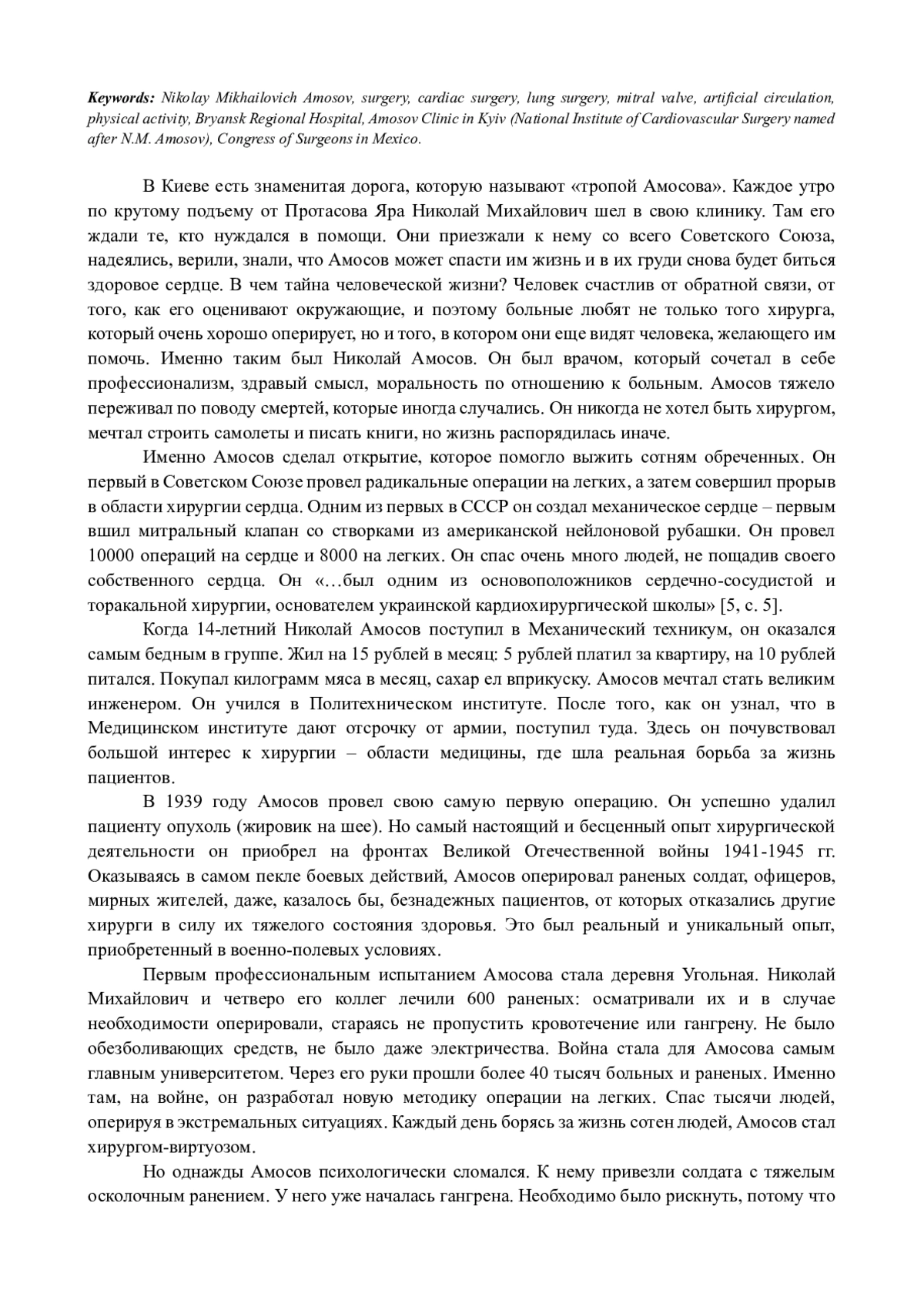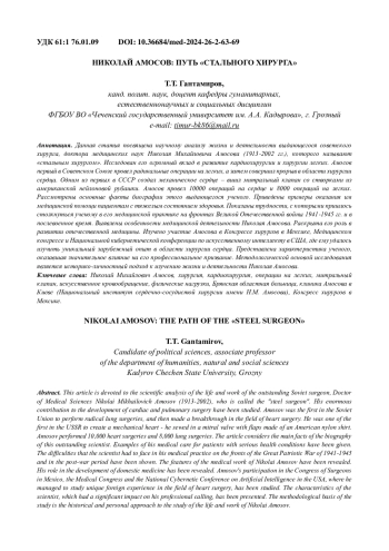 Данная статья посвящена научному анализу жизни и деятельности выдающегося советского хирурга, доктора медицинских наук Николая Михайловича Амосова (1913-2002 гг.), которого называют «стальным хирургом». Исследован его огромный вклад в развитие кардиохирургии и хирургии легких. Амосов первый в Советском Союзе провел радикальные операции на легких, а затем совершил прорыв в области хирургии сердца. Одним из первых в СССР создал механическое сердце - вшил митральный клапан со створками из американской нейлоновой рубашки. Амосов провел 10000 операций на сердце и 8000 операций на легких. Рассмотрены основные факты биографии этого выдающегося ученого. Приведены примеры оказания им медицинской помощи пациентам с тяжелым состоянием здоровья. Показаны трудности, с которыми пришлось столкнуться ученому в его медицинской практике на фронтах Великой Отечественной войны 1941-1945 гг. и в послевоенное время. Выявлены особенности медицинской деятельности Николая Амосова. Раскрыта его роль в развитии отечественной медицины. Изучено участие Амосова в Конгрессе хирургов в Мексике, Медицинском конгрессе и Национальной кибернетической конференции по искусственному интеллекту в США, где ему удалось изучить уникальный зарубежный опыт в области хирургии сердца. Представлена характеристика ученого, оказавшая значительное влияние на его профессиональное призвание. Методологической основой исследования является историко-личностный подход к изучению жизни и деятельности Николая Амосова.
