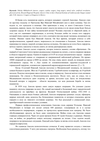2. Глянцев С.П., Андреева А.В. Николай Михайлович Амосов - выдающийся выпускник Архангельского медицинского института: к 100-летию со дня рождения // Экология человека. 2013. № 12. - С. 56-60. EDN: RQBHKN