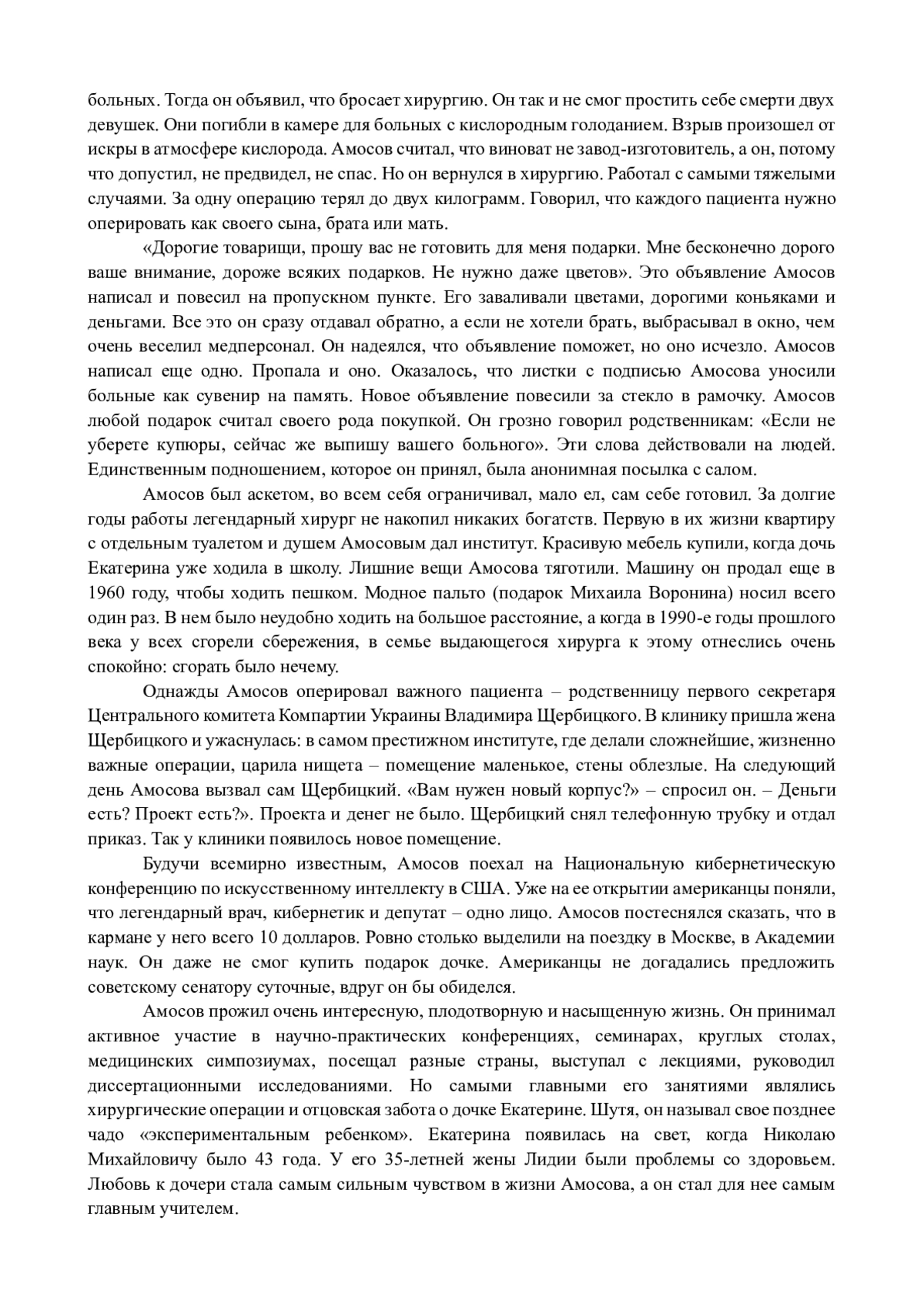 В Киеве есть знаменитая дорога, которую называют «тропой Амосова». Каждое утро по крутому подъему от Протасова Яра Николай Михайлович шел в свою клинику. Там его ждали те, кто нуждался в помощи. Они приезжали к нему со всего Советского Союза, надеялись, верили, знали, что Амосов может спасти им жизнь и в их груди снова будет биться здоровое сердце. В чем тайна человеческой жизни? Человек счастлив от обратной связи, от того, как его оценивают окружающие, и поэтому больные любят не только того хирурга, который очень хорошо оперирует, но и того, в котором они еще видят человека, желающего им помочь. Именно таким был Николай Амосов. Он был врачом, который сочетал в себе профессионализм, здравый смысл, моральность по отношению к больным. Амосов тяжело переживал по поводу смертей, которые иногда случались. Он никогда не хотел быть хирургом, мечтал строить самолеты и писать книги, но жизнь распорядилась иначе.