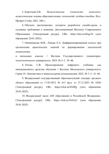 3. Как организовать дистанционный урок: подходы и ресурсы. Просвещение. [Электронный ресурс]. URL: https://prosv.ru/pages/kak-organizovat-distancionnyj-urok-podhody-i-resursy.html (дата обращения: 29.01.2025).