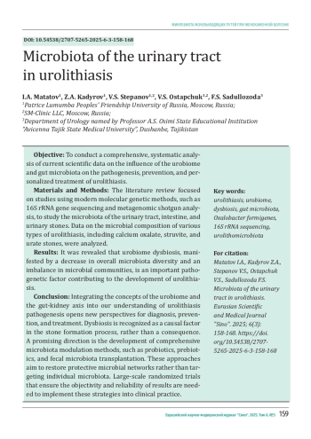Заключение. Интеграция концепций уробиома и оси «кишечник–почки» в понимание патогенеза мочекаменной болезни открывает новые перспективы для диагностики, профилактики и лечения. Дисбиоз признан не следствием, а причинно-значимым звеном в процессе камнеобразования. Перспективным направлением является создание комплексных методов модуляции микробиоты, таких как пробиотики, пребиотики и трансплантация фекальной микробиоты. Эти подходы направлены на восстановление протективных микробных сетей, а не на коррекцию отдельных видов. Для внедрения этих стратегий в клиническую практику необходимы масштабированные рандомизированные исследования, которые обеспечивают объективность и надёжность результатов.