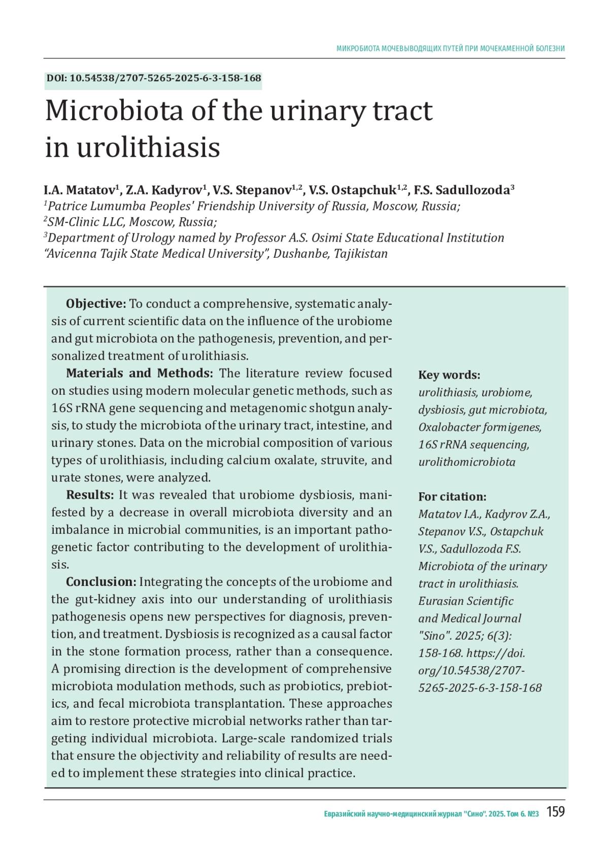 Цель исследования. Провести всесторонний систематический анализ современных научных данных о влиянии уробиома и кишечной микробиоты на патогенез, профилактику и персонализацию лечения мочекаменной болезни.