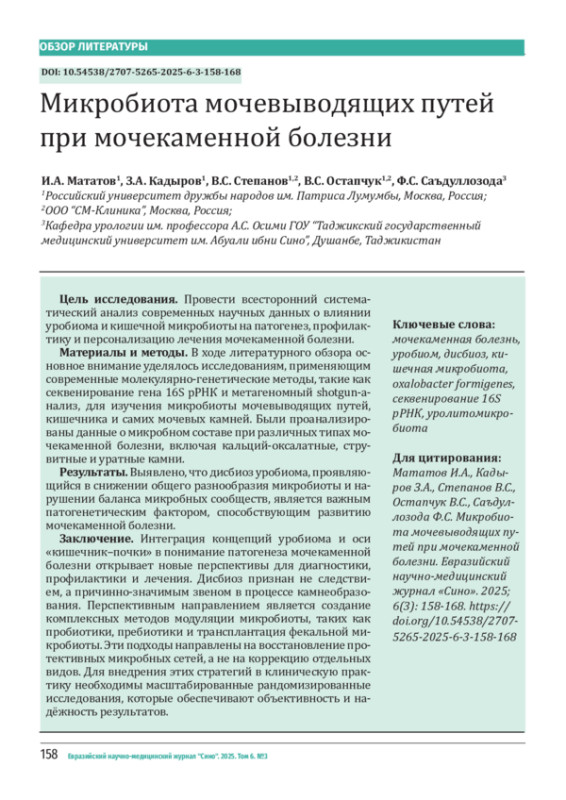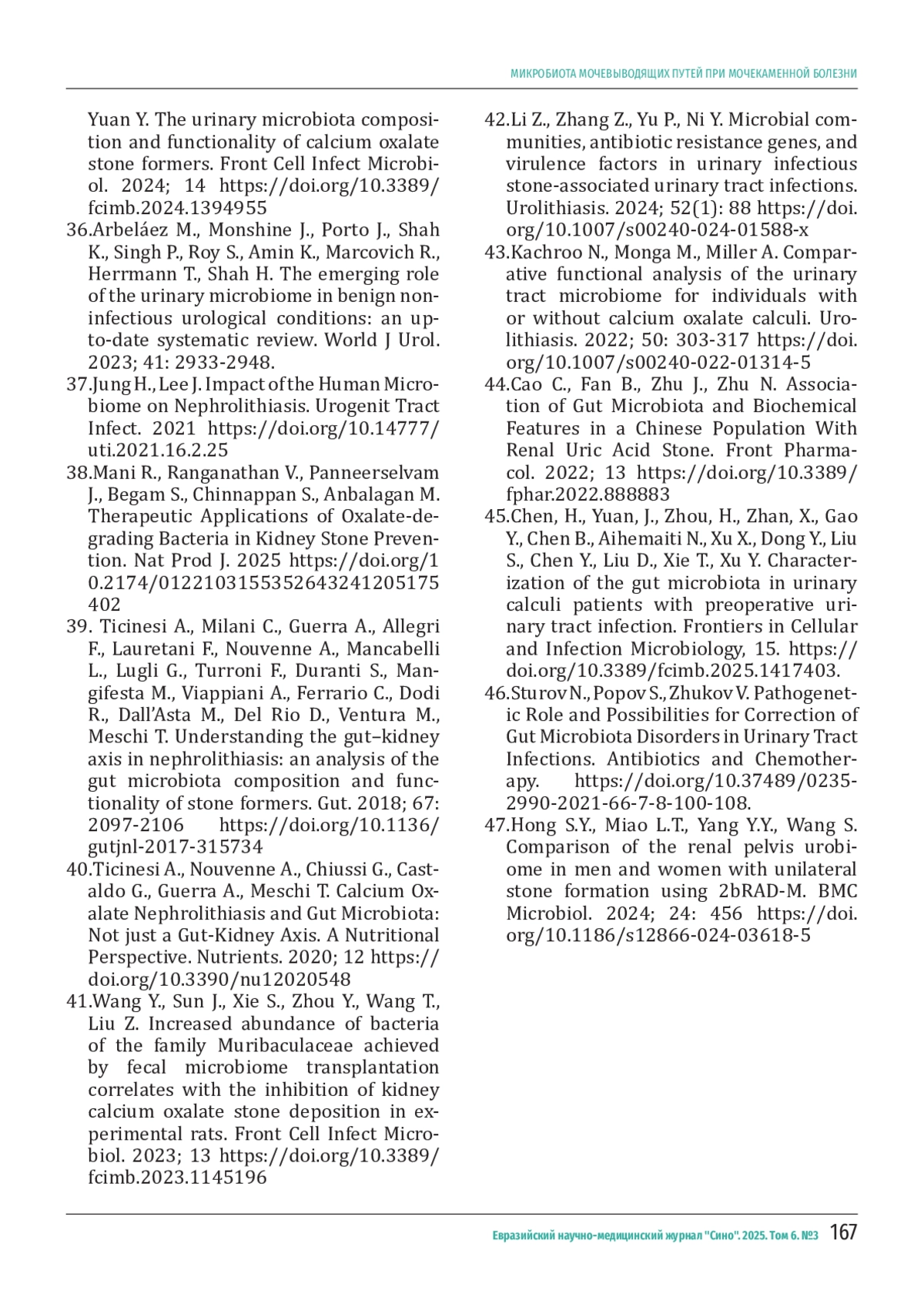 32. Galán-Llopis J., Sánchez-Pellicer P., Navarro-López V. Role of microbiome in kidney stone disease. Curr Opin Urol. 2022; 33: 84-89. DOI: 10.1097/MOU.0000000000001051