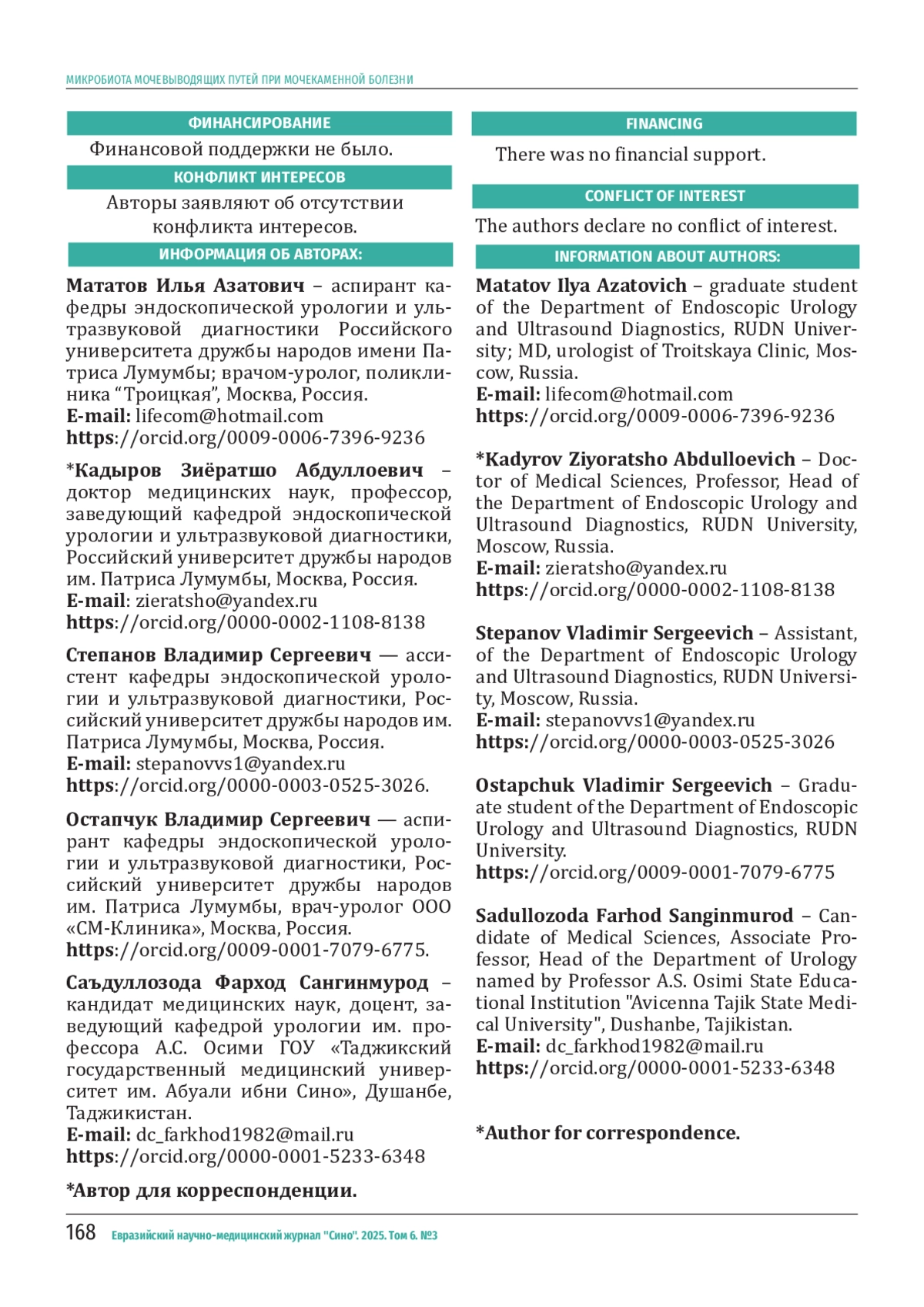 42. Li Z., Zhang Z., Yu P., Ni Y. Microbial communities, antibiotic resistance genes, and virulence factors in urinary infectious stone-associated urinary tract infections. Urolithiasis. 2024; 52(1): 88. DOI: 10.1007/s00240-024-01588-x