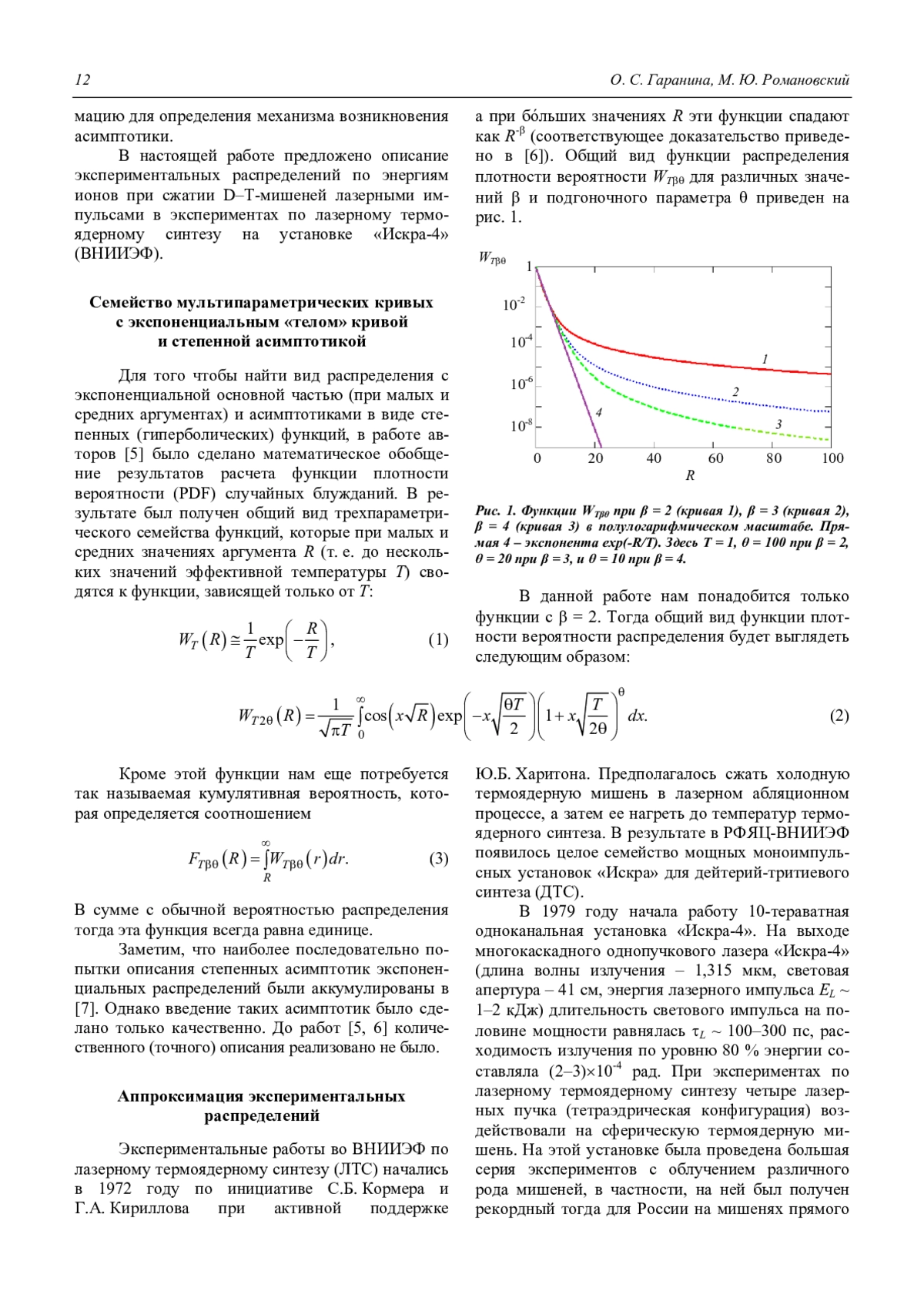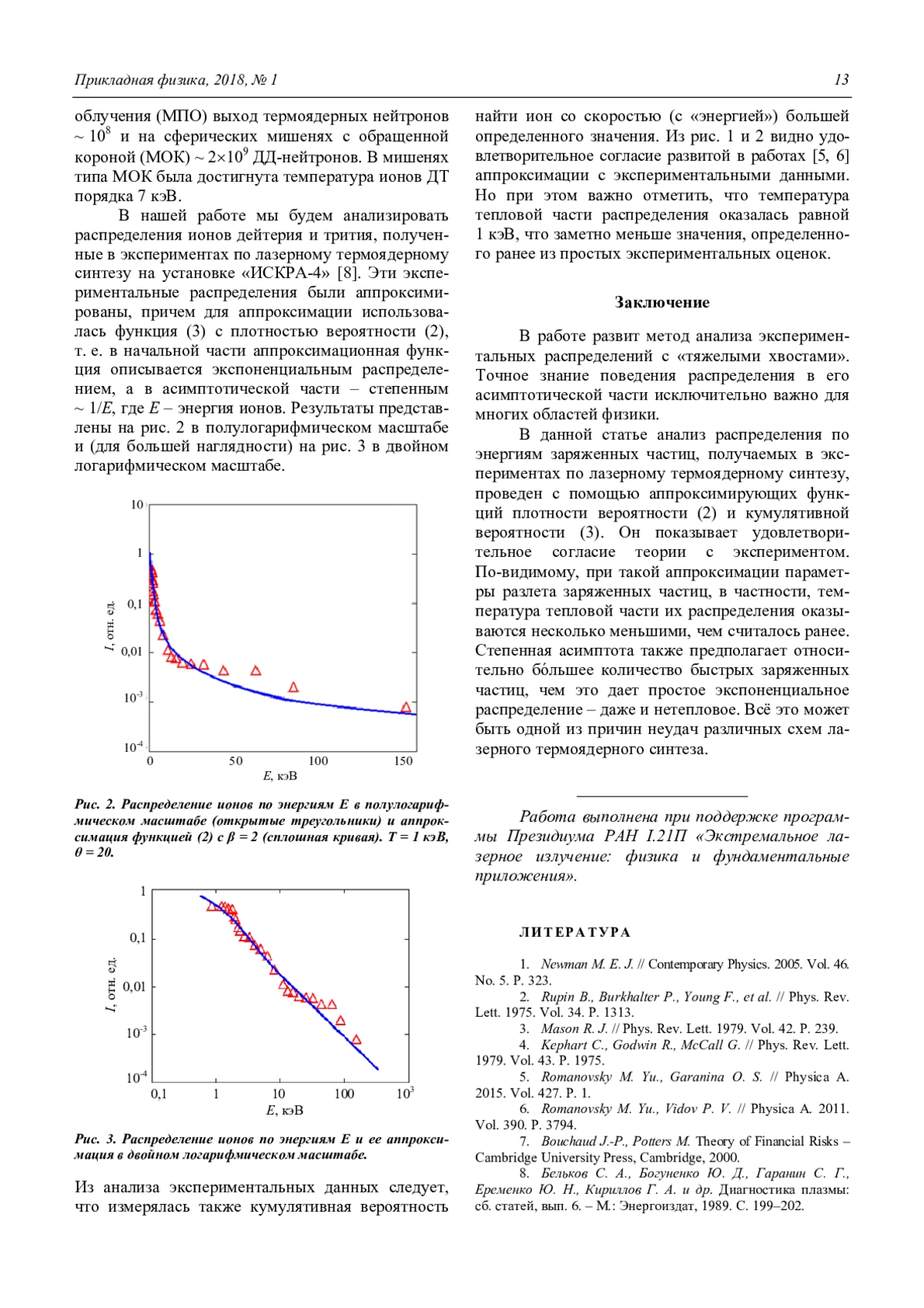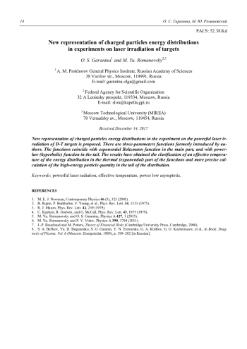 ГАРАНИНА О. С., РОМАНОВСКИЙ М. Ю. АНАЛИЗ РАСПРЕДЕЛЕНИЯ ПО ЭНЕРГИИ ЗАРЯЖЕННЫХ ЧАСТИЦ В ЭКСПЕРИМЕНТАХ ПО ЛАЗЕРНОМУ ОБЛУЧЕНИЮ МИШЕНЕЙ // ПРИКЛАДНАЯ ФИЗИКА. 2018. №1