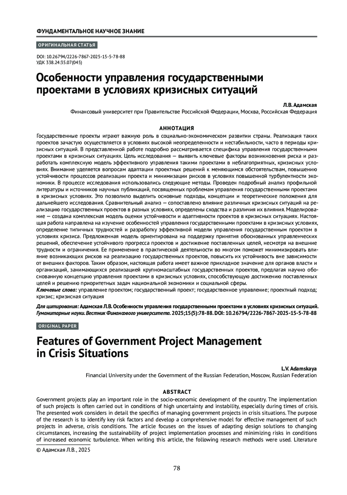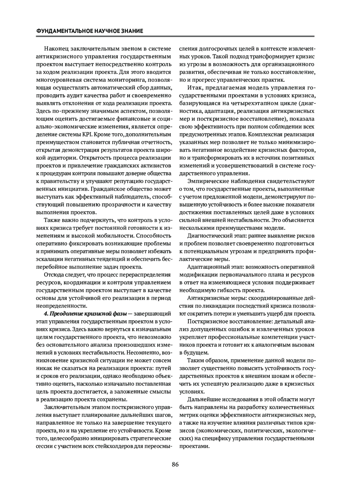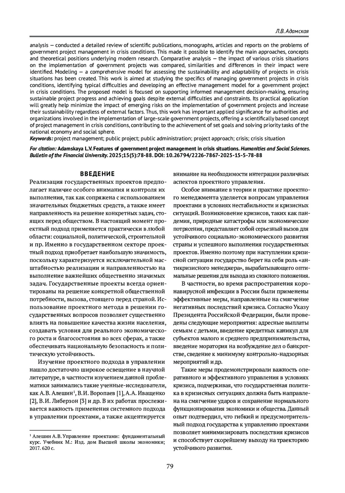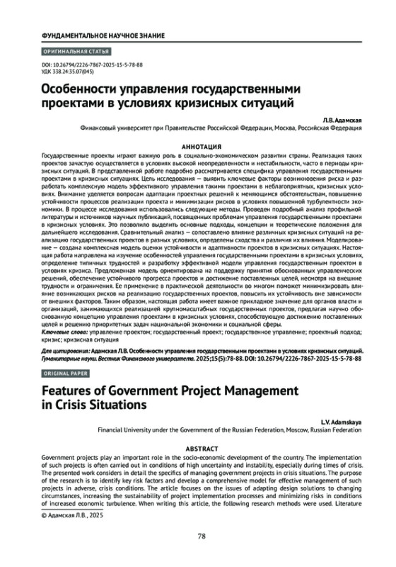 Государственные проекты играют важную роль в социально-экономическом развитии страны. Реализация таких проектов зачастую осуществляется в условиях высокой неопределенности и нестабильности, часто в периоды кризисных ситуаций. В представленной работе подробно рассматривается специфика управления государственными проектами в кризисных ситуациях. Цель исследования — выявить ключевые факторы возникновения риска и разработать комплексную модель эффективного управления такими проектами в неблагоприятных, кризисных условиях. Внимание уделяется вопросам адаптации проектных решений к меняющимся обстоятельствам, повышению устойчивости процессов реализации проекта и минимизации рисков в условиях повышенной турбулентности экономики. В процессе исследования использовались следующие методы. Проведен подробный анализ профильной литературы и источников научных публикаций, посвященных проблемам управления государственными проектами в кризисных условиях. Это позволило выделить основные подходы, концепции и теоретические положения для дальнейшего исследования. Сравнительный анализ — сопоставлено влияние различных кризисных ситуаций на реализацию государственных проектов в разных условиях, определены сходства и различия их влияния. Моделирование — создана комплексная модель оценки устойчивости и адаптивности проектов в кризисных ситуациях. Настоящая работа направлена на изучение особенностей управления государственными проектами в кризисных условиях, определение типичных трудностей и разработку эффективной модели управления государственным проектом в условиях кризиса. Предложенная модель ориентирована на поддержку принятия обоснованных управленческих решений, обеспечение устойчивого прогресса проектов и достижение поставленных целей, несмотря на внешние трудности и ограничения. Ее применение в практической деятельности во многом поможет минимизировать влияние возникающих рисков на реализацию государственных проектов, повысить их устойчивость вне зависимости от внешних факторов. Таким образом, настоящая работа имеет важное прикладное значение для органов власти и организаций, занимающихся реализацией крупномасштабных государственных проектов, предлагая научно обоснованную концепцию управления проектами в кризисных условиях, способствующую достижению поставленных целей и решению приоритетных задач национальной экономики и социальной сферы.