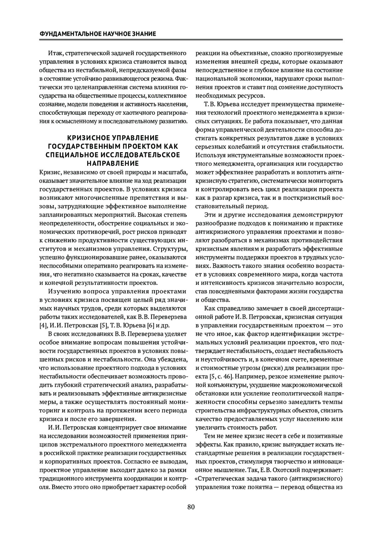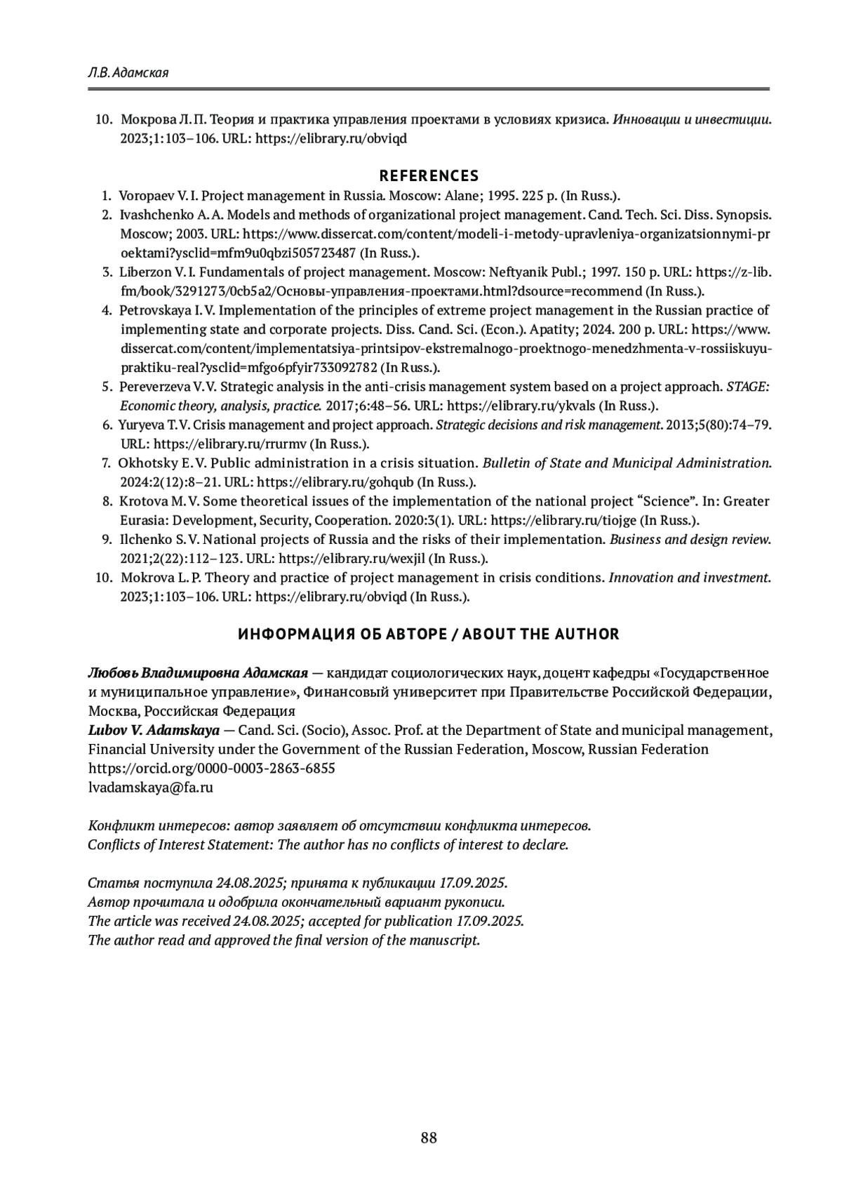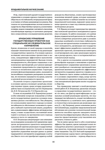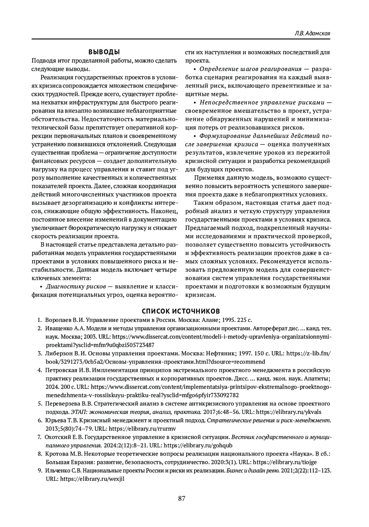 Государственные проекты играют важную роль в социально-экономическом развитии страны. Реализация таких проектов зачастую осуществляется в условиях высокой неопределенности и нестабильности, часто в периоды кризисных ситуаций. В представленной работе подробно рассматривается специфика управления государственными проектами в кризисных ситуациях. Цель исследования — выявить ключевые факторы возникновения риска и разработать комплексную модель эффективного управления такими проектами в неблагоприятных, кризисных условиях. Внимание уделяется вопросам адаптации проектных решений к меняющимся обстоятельствам, повышению устойчивости процессов реализации проекта и минимизации рисков в условиях повышенной турбулентности экономики. В процессе исследования использовались следующие методы. Проведен подробный анализ профильной литературы и источников научных публикаций, посвященных проблемам управления государственными проектами в кризисных условиях. Это позволило выделить основные подходы, концепции и теоретические положения для дальнейшего исследования. Сравнительный анализ — сопоставлено влияние различных кризисных ситуаций на реализацию государственных проектов в разных условиях, определены сходства и различия их влияния. Моделирование — создана комплексная модель оценки устойчивости и адаптивности проектов в кризисных ситуациях. Настоящая работа направлена на изучение особенностей управления государственными проектами в кризисных условиях, определение типичных трудностей и разработку эффективной модели управления государственным проектом в условиях кризиса. Предложенная модель ориентирована на поддержку принятия обоснованных управленческих решений, обеспечение устойчивого прогресса проектов и достижение поставленных целей, несмотря на внешние трудности и ограничения. Ее применение в практической деятельности во многом поможет минимизировать влияние возникающих рисков на реализацию государственных проектов, повысить их устойчивость вне зависимости от внешних факторов. Таким образом, настоящая работа имеет важное прикладное значение для органов власти и организаций, занимающихся реализацией крупномасштабных государственных проектов, предлагая научно обоснованную концепцию управления проектами в кризисных условиях, способствующую достижению поставленных целей и решению приоритетных задач национальной экономики и социальной сферы.