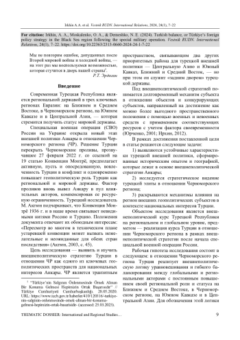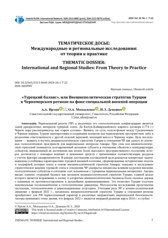 Цель исследования - выявить и изучить внешнеполитическую стратегию Турции в отношении ЧР как одного из ключевых геополитических пространств для национальных интересов Анкары. При этом под внешнеполитической стратегией понимается долговременный механизм субъекта в отношении объектов и конкурирующих субъектов, направленный на достижение как можно более выгодного пространственного положения, которое достигается с помощью военных и невоенных средств с применением соответствующих ресурсов с учетом фактора своевременности. В рамках достижения поставленной цели решаются конкретные задачи: выявлены устойчивые характеристики турецкой внешней политики, сформированные историческим опытом и географией, которые лежат в основе внешнеполитической стратегии Анкары; показано и исследовано стратегическое видение турецкой элиты в отношении ЧР; раскрыты механизмы влияния на регион внешних геополитических субъектов и сочетание этих механизмов с турецкими национальными интересами. Авторы вводят понятие «турецкий баланс» как механизм внешнеполитической стратегии Турции, главной целью которого является встраивание в логику и алгоритмы внешнеполитических балансов более сильных держав с взаимным их противопоставлением и дальнейшим уравновешиванием. Это позволяет Турции получать максимальные геоэкономические и геополитические дивиденды. Методология исследования представлена системным, геополитическим и цивилизационным подходами. Учитывая роль ЧР в военно-политической динамике с февраля 2022 г., механизмы внешнеполитической стратегии Турции в отношении региона приобретают для РФ первостепенный характер в различных направлениях национальной безопасности. Авторы принимают точку зрения, что февраль 2022 г. является инерцией развития марта 2014 г. и глубже - отложенным кризисом 1991 г., вызванным дезинтеграцией СССР. Однако именно начало специальной военной операции (СВО) вывело военно-политические противоборство на глобальном и региональном уровне в формат открытого противостояния. Россия бросила открытый вызов Западу и его системе союзников.