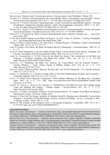 7. Ирхин А. А., Москаленко О. А. Черноморский регион в конкуренции геополитических проектов великих держав в 1991-2019 гг. // Вестник Российского университета дружбы народов. Серия: Международные отношения. 2021. Т. 21, № 3. С. 498-516. DOI: 10.22363/2313-0660-2021-21-3-498-516 EDN: IWKWGT
