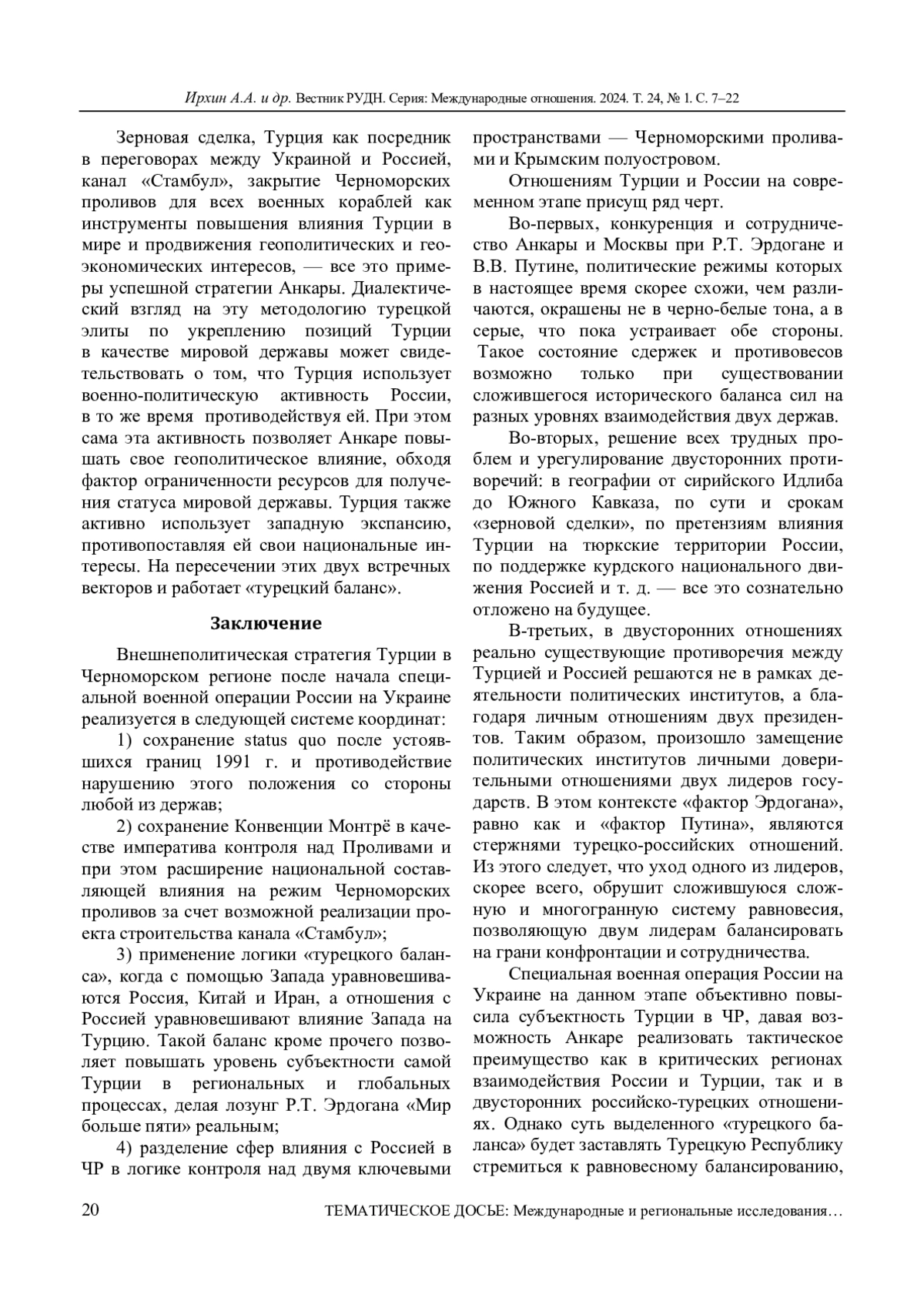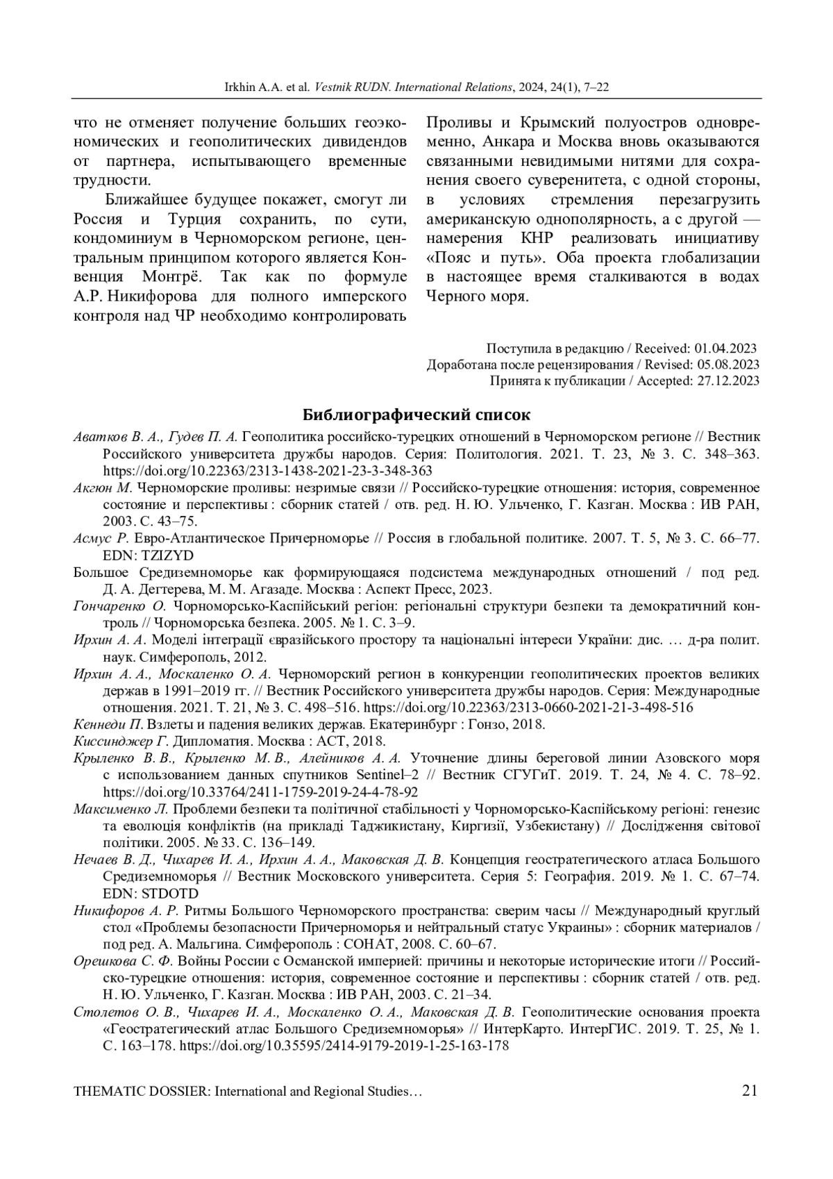 1. Аватков В. А., Гудев П. А. Геополитика российско-турецких отношений в Черноморском регионе // Вестник Российского университета дружбы народов. Серия: Политология. 2021. Т. 23, № 3. C. 348-363. DOI: 10.22363/2313-1438-2021-23-3-348-363 EDN: FDHWEO