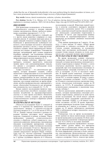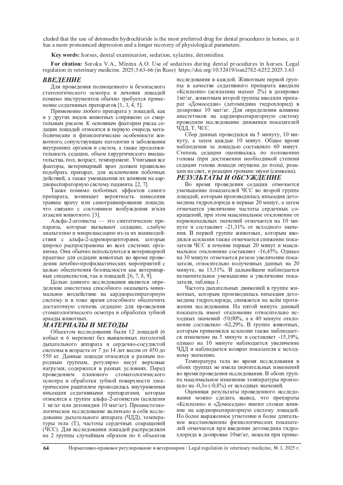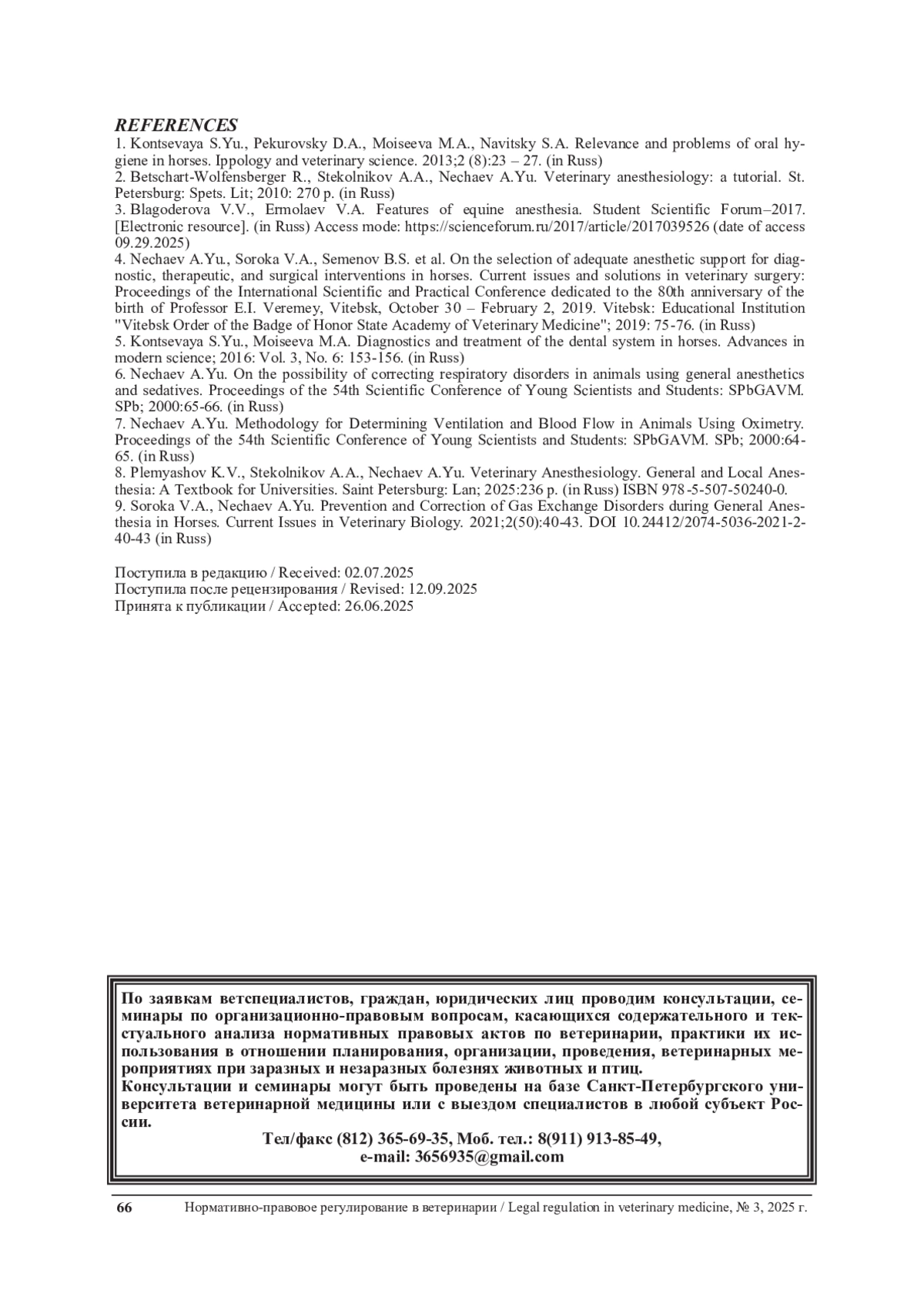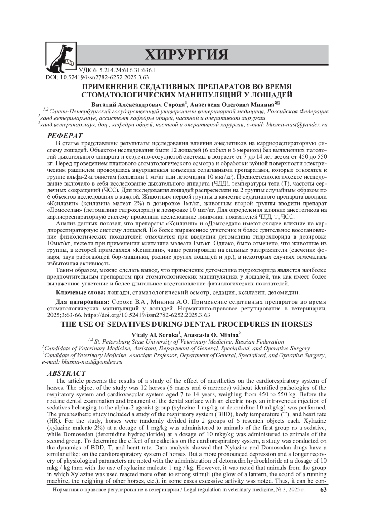 СОРОКА В. А., МИНИНА А. О. ПРИМЕНЕНИЕ СЕДАТИВНЫХ ПРЕПАРАТОВ ВО ВРЕМЯ СТОМАТОЛОГИЧЕСКИХ МАНИПУЛЯЦИЙ У ЛОШАДЕЙ // НОРМАТИВНО-ПРАВОВОЕ РЕГУЛИРОВАНИЕ В ВЕТЕРИНАРИИ. 2025. № 3