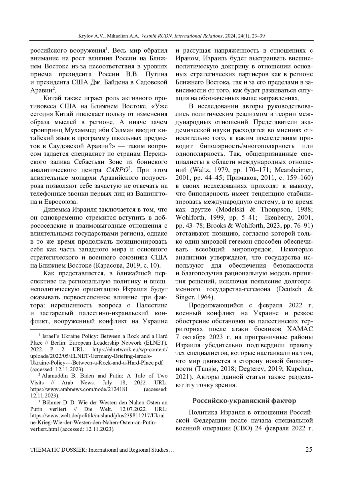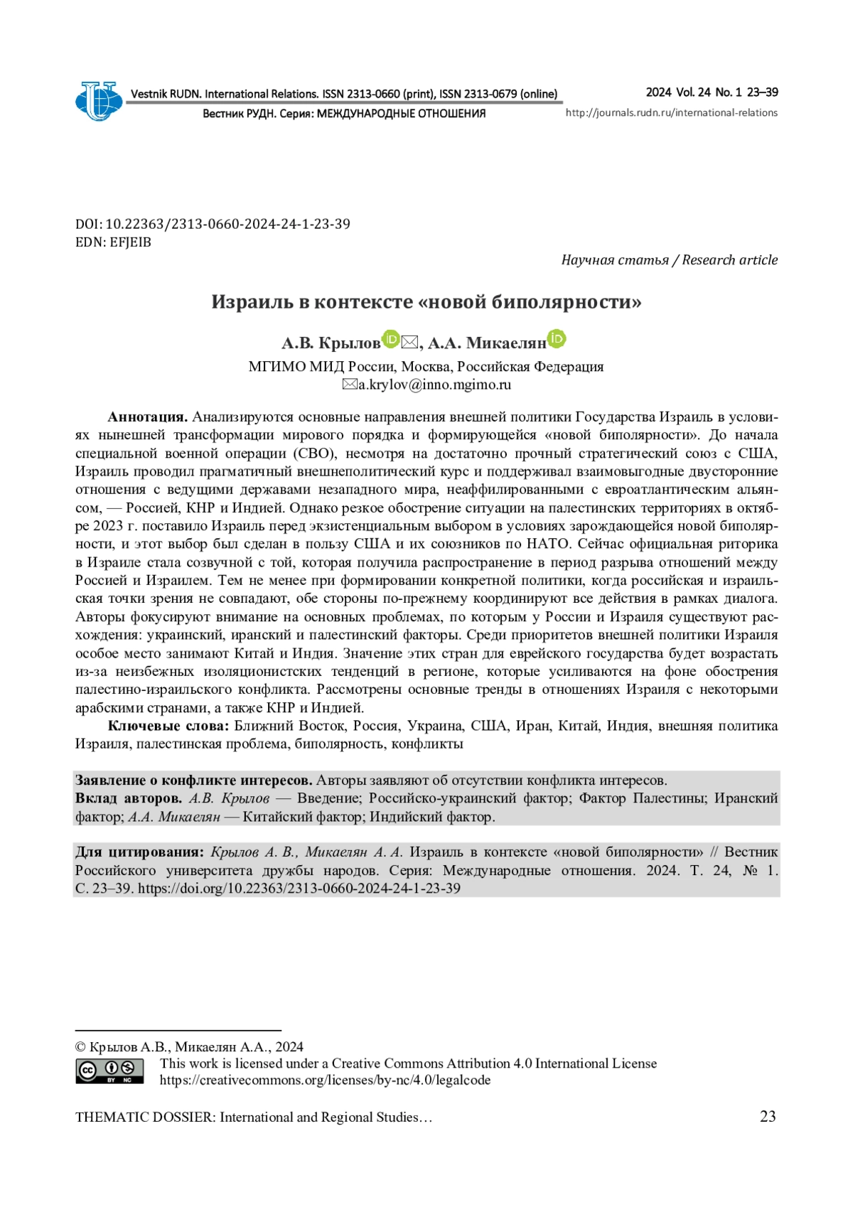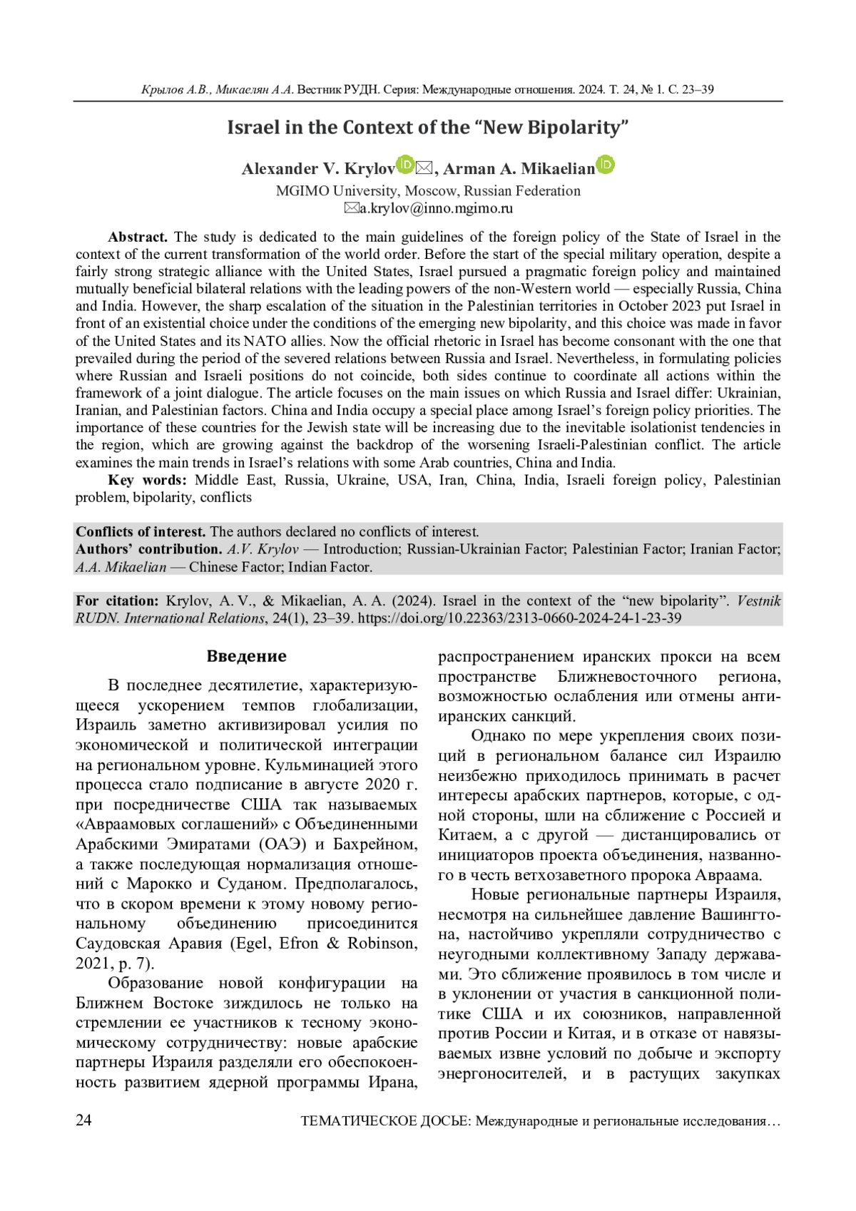 5. Микаелян А. А., Морозов В. М. Фактор США в израильско-китайских и израильско-индийских отношениях // Вестник Российского университета дружбы народов. Серия: Международные отношения. 2021. Т. 21, № 2. С. 338-349. DOI: 10.22363/2313-0660-2021-21-2-338-349 EDN: IVFFSH
