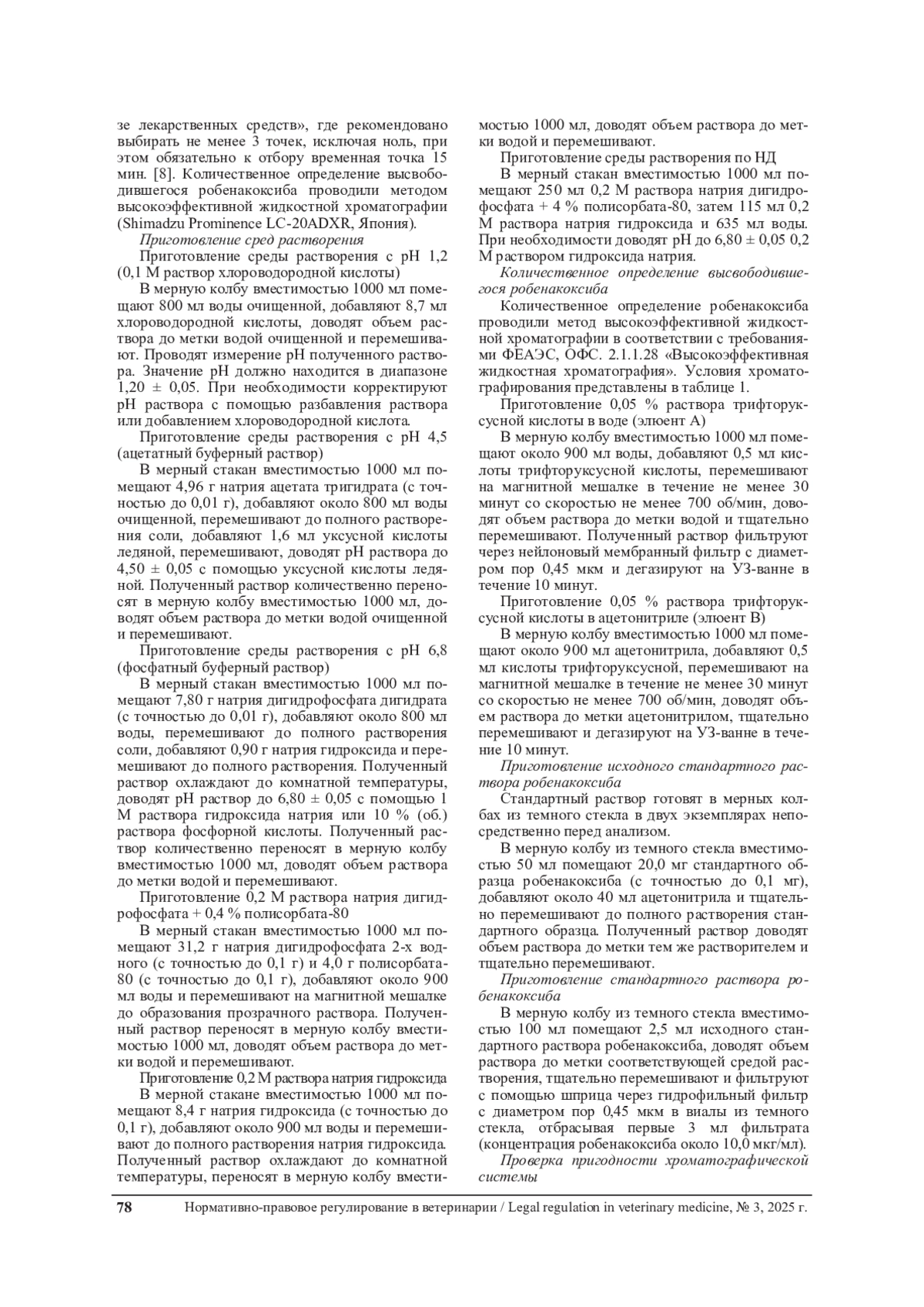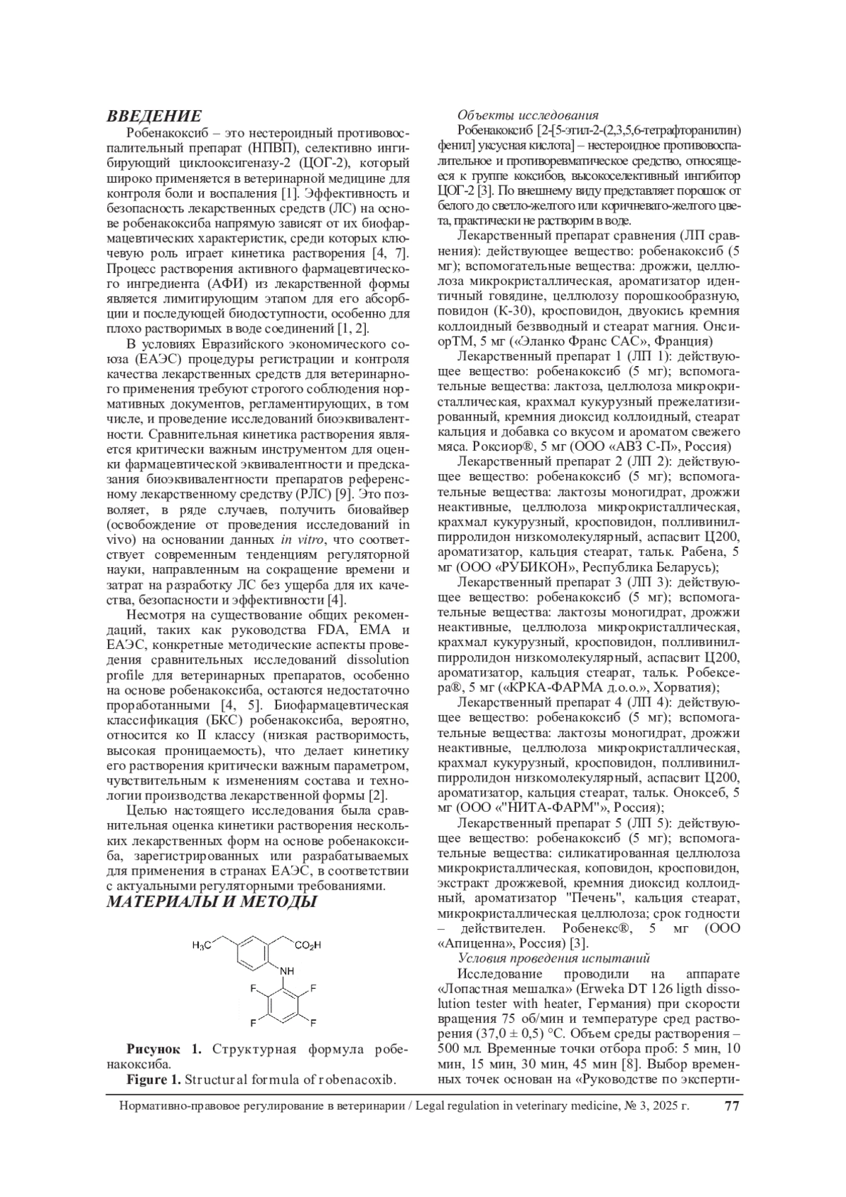 Робенакоксиб – это нестероидный противовоспалительный препарат (НПВП), селективно ингибирующий циклооксигеназу-2 (ЦОГ-2), который широко применяется в ветеринарной медицине для контроля боли и воспаления [1]. Эффективность и безопасность лекарственных средств (ЛС) на основе робенакоксиба напрямую зависят от их биофармацевтических характеристик, среди которых ключевую роль играет кинетика растворения [4, 7]. Процесс растворения активного фармацевтического ингредиента (АФИ) из лекарственной формы является лимитирующим этапом для его абсорбции и последующей биодоступности, особенно для плохо растворимых в воде соединений [1, 2].
