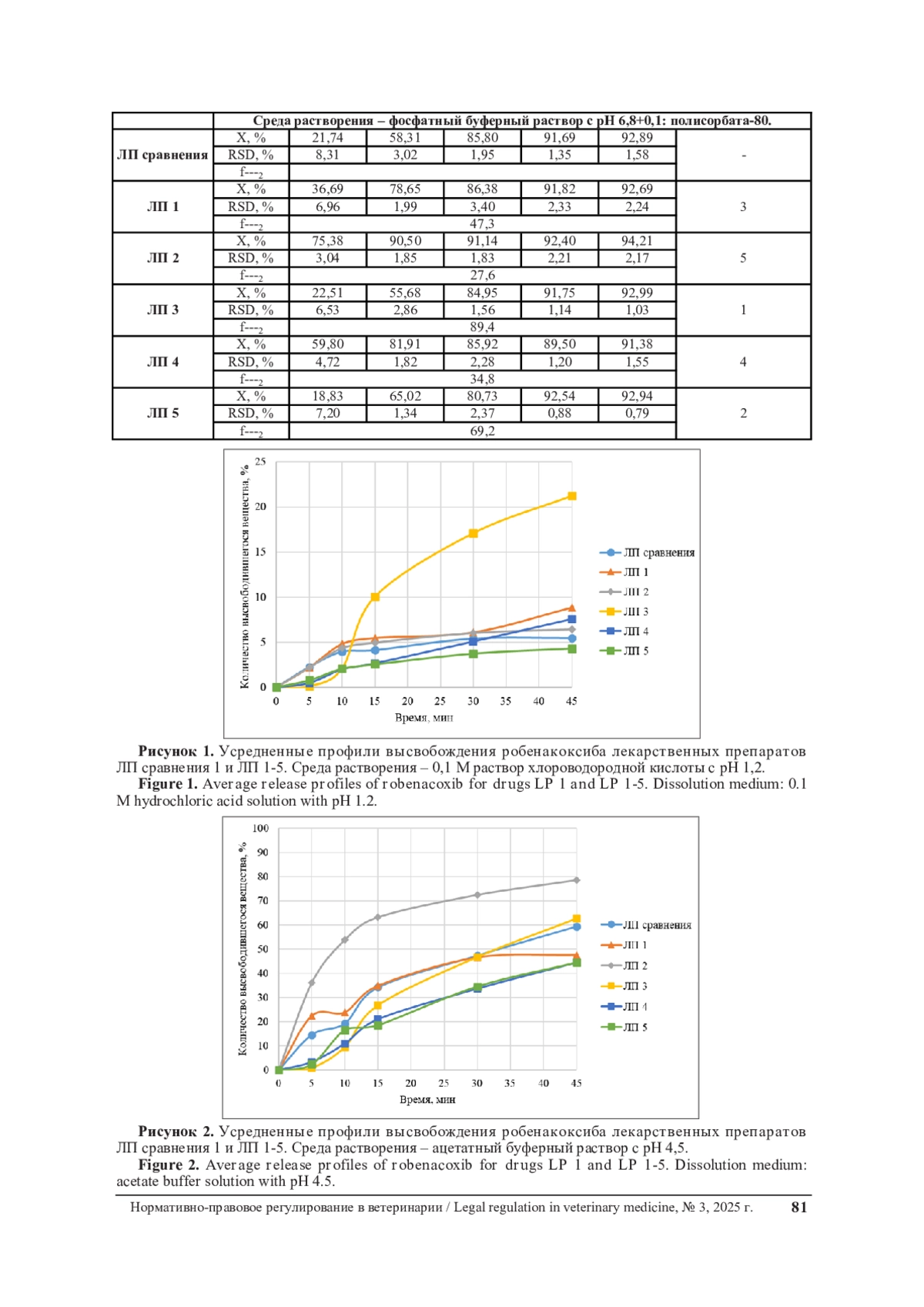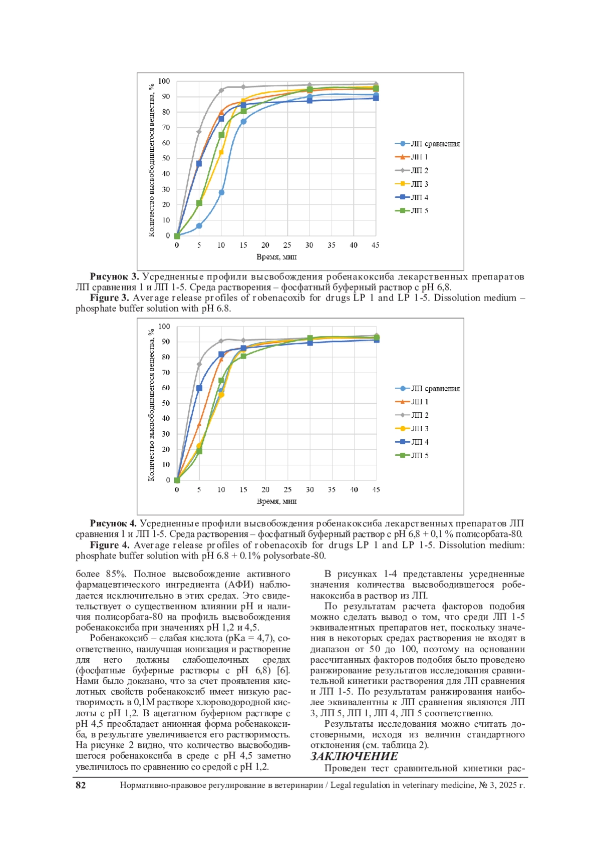 Проведен сравнительный тест кинетики растворения лекарственных препаратов на основе робенакоксиба зарубежный и отечественных производителей в трех средах растворения, моделирующих основные разделы ЖКТ животного, и в среде растворения по НД компании ООО «Апиценна». Целью настоящего исследования была сравнительная оценка кинетики растворения нескольких лекарственных форм на основе робенакоксиба, зарегистрированных или разрабатываемых для применения в странах ЕАЭС, в соответствии с актуальными регуляторными требованиями. Количественное определение высвободившегося действующего вещества проводили методом высокоэффективной жидкостной хроматографии (ВЭЖХ) при длине волны 275 нм. Эксперименты выполняли на аппарате «Лопастная мешалка», точки отбора соответствовали 5, 10, 15 и 30 минутам. Результаты показали, что оптимальной средой растворения для робенакоксиба является фосфатный буферный раствор с pH 6,8, обеспечивающий наилучшее высвобождение активного фармацевтического ингредиента. По результатам ранжирования, исходя из рассчитанных факторов подобия, наиболее эквивалентны к ЛП сравнения являются следующие препараты: ЛП 3, ЛП 5, ЛП 1, ЛП 4, ЛП 2 в порядке уменьшения. Проведенное исследование углубляет понимание биофармацевтических свойств робенакоксиба и вносит вклад в развитие научно обоснованного регуляторного подхода к оценке качества ветеринарных препаратов на пространстве ЕАЭС.