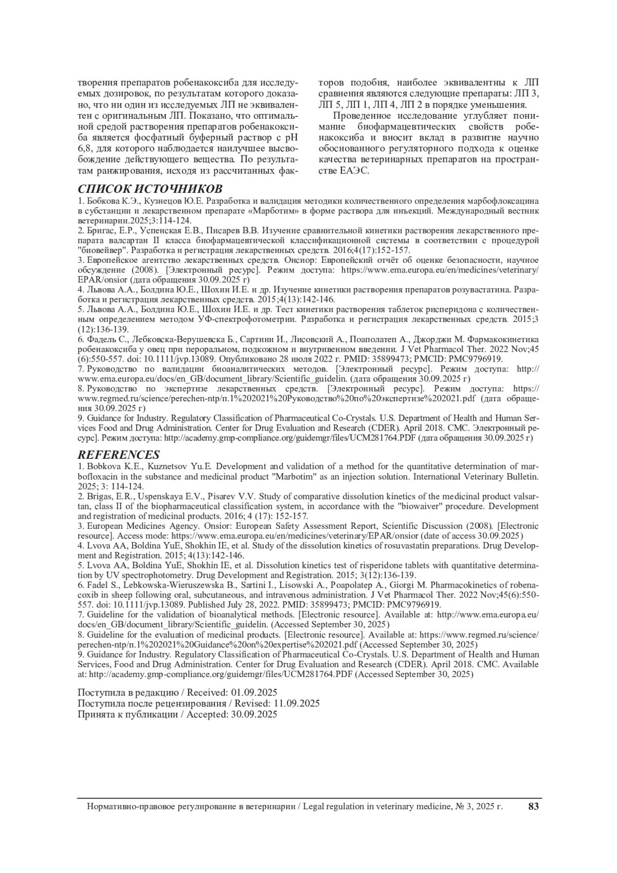1. Бобкова К.Э., Кузнецов Ю.Е. Разработка и валидация методики количественного определения марбофлоксацина в субстанции и лекарственном препарате “Марботим” в форме раствора для инъекций. Международный вестник ветеринарии.2025;3:114-124.