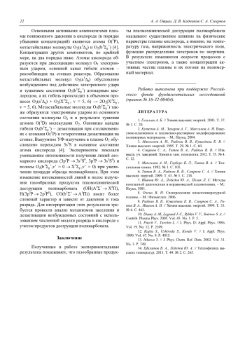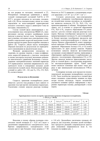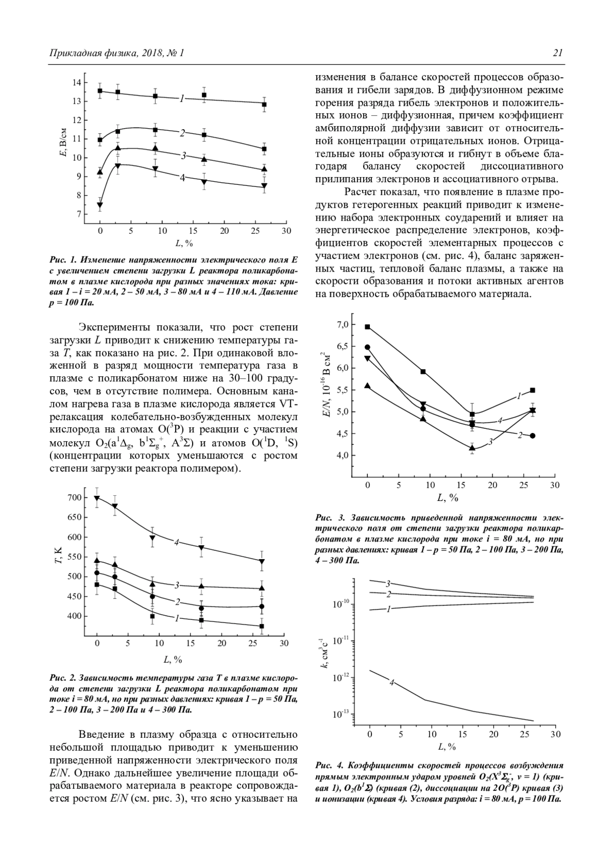 Представлены экспериментальные данные о параметрах плазмы и о составе газообразных продуктов при обработке пленки поликарбоната в плазме пониженного давления (50–300 Па) в кислороде. Анализ газовой фазы проводили методами эмиссионной спектроскопии и массспектрометрии. При различной площади обрабатываемого материала измерена напряженность электрического поля и температура газа на оси разряда, мольные доли продуктов деструкции полимера. Рассчитана функция распределения электронов по энергиям. Показано, что с увеличением площади обрабатываемого материала в реакторе изменяется приведенная напряженность электрического поля, температура газа, средняя энергия электронов и коэффициенты скоростей процессов с участием электронов.