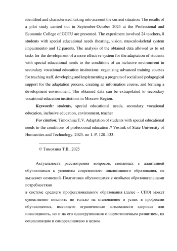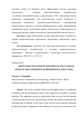 ТИМОХИНА Т. В. АДАПТАЦИЯ ОБУЧАЮЩИХСЯ С ОСОБЫМИ ОБРАЗОВАТЕЛЬНЫМИ ПОТРЕБНОСТЯМИ В УСЛОВИЯХ ПРОФЕССИОНАЛЬНОГО ОБРАЗОВАНИЯ // ВЕСТНИК ГОСУДАРСТВЕННОГО ГУМАНИТАРНО-ТЕХНОЛОГИЧЕСКОГО УНИВЕРСИТЕТА. 2025. № 1