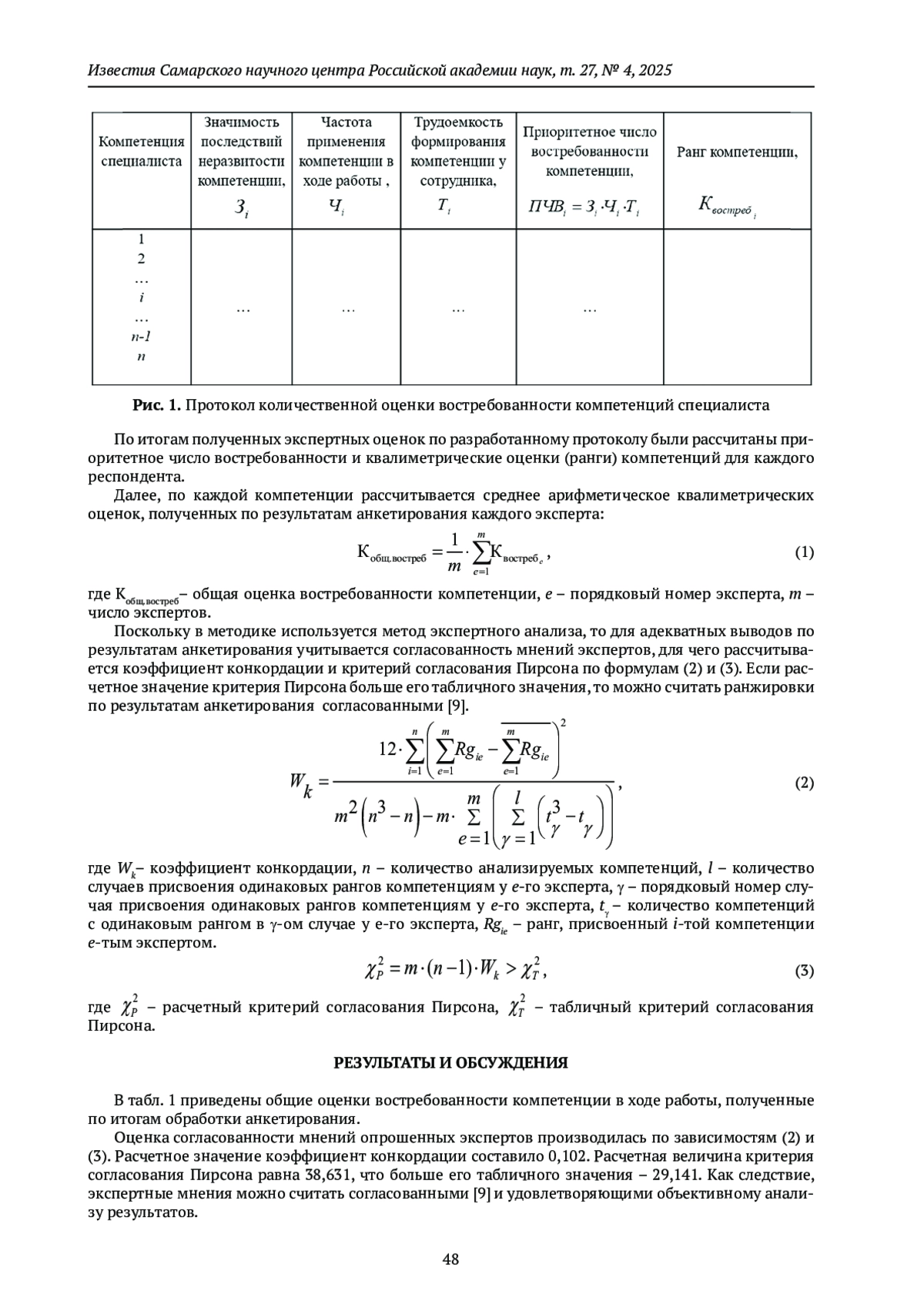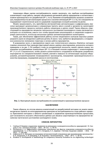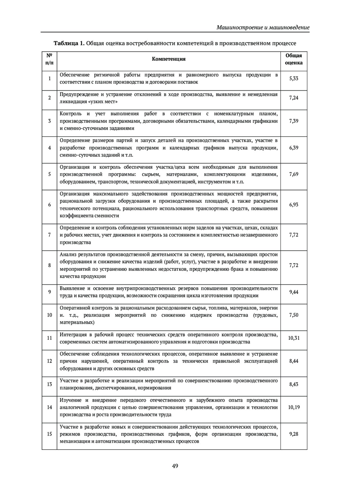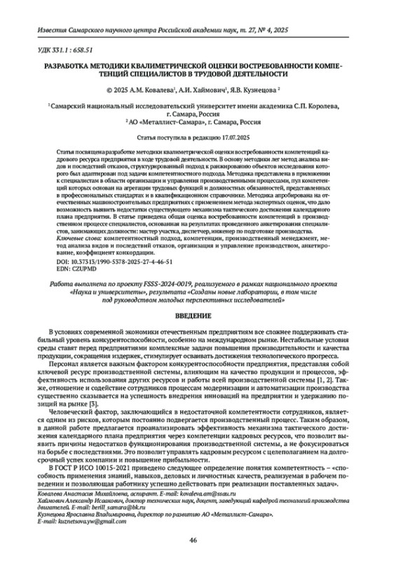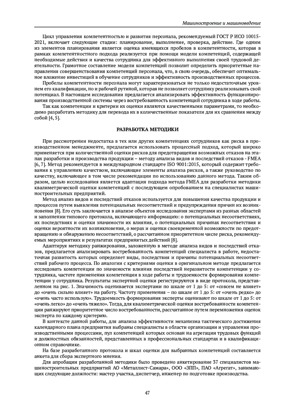 Статья посвящена разработке методики квалиметрической оценки востребованности компетенций кадрового ресурса предприятия в ходе трудовой деятельности. В основу методики лег метод анализа видов и последствий отказов, структурированный подход к ранжированию объектов исследования которого был адаптирован под задачи компетентностного подхода. Методика представлена в приложении к специалистам в области организации и управления производственными процессами, пул компетенций которых основан на агрегации трудовых функций и должностных обязанностей, представленных в профессиональных стандартах и в квалификационном справочнике. Методика апробирована на отечественных машиностроительных предприятиях с применением метода экспертных оценок, что дало возможность выявить недостатки существующего механизма тактического достижения календарного плана предприятия. В статье приведена общая оценка востребованности компетенций в производственном процессе специалистов, основанная на результатах проведенного анкетирования специалистов, занимающих должности: мастер участка, диспетчер, инженер по подготовке производства.