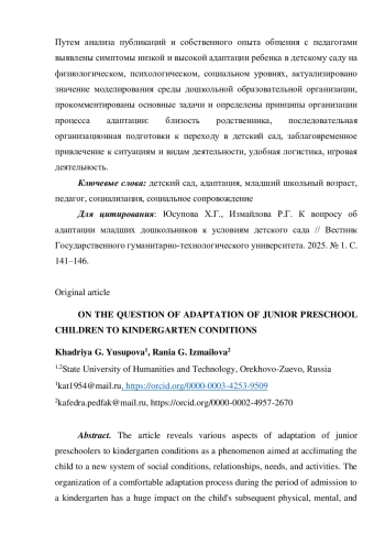 3. Ельникова О.Е., Меренкова В.С. Особенности адаптации к дошкольной образовательной организации детей, имеющих разный уровень здоровья // Научно-педагогическое обозрение. 2024. № 3 (55). С. 146-153. EDN: AFFLGT