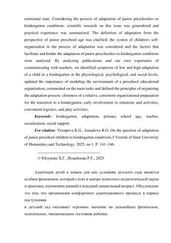 1. Байметова А.Э. Социально-психологическая адаптация детей раннего возраста к условиям дошкольной образовательной организации // Научный форум: сборник статей VII Международной научно-практической конференции. Пенза, 2024. С. 290-293. EDN: AMMIHG