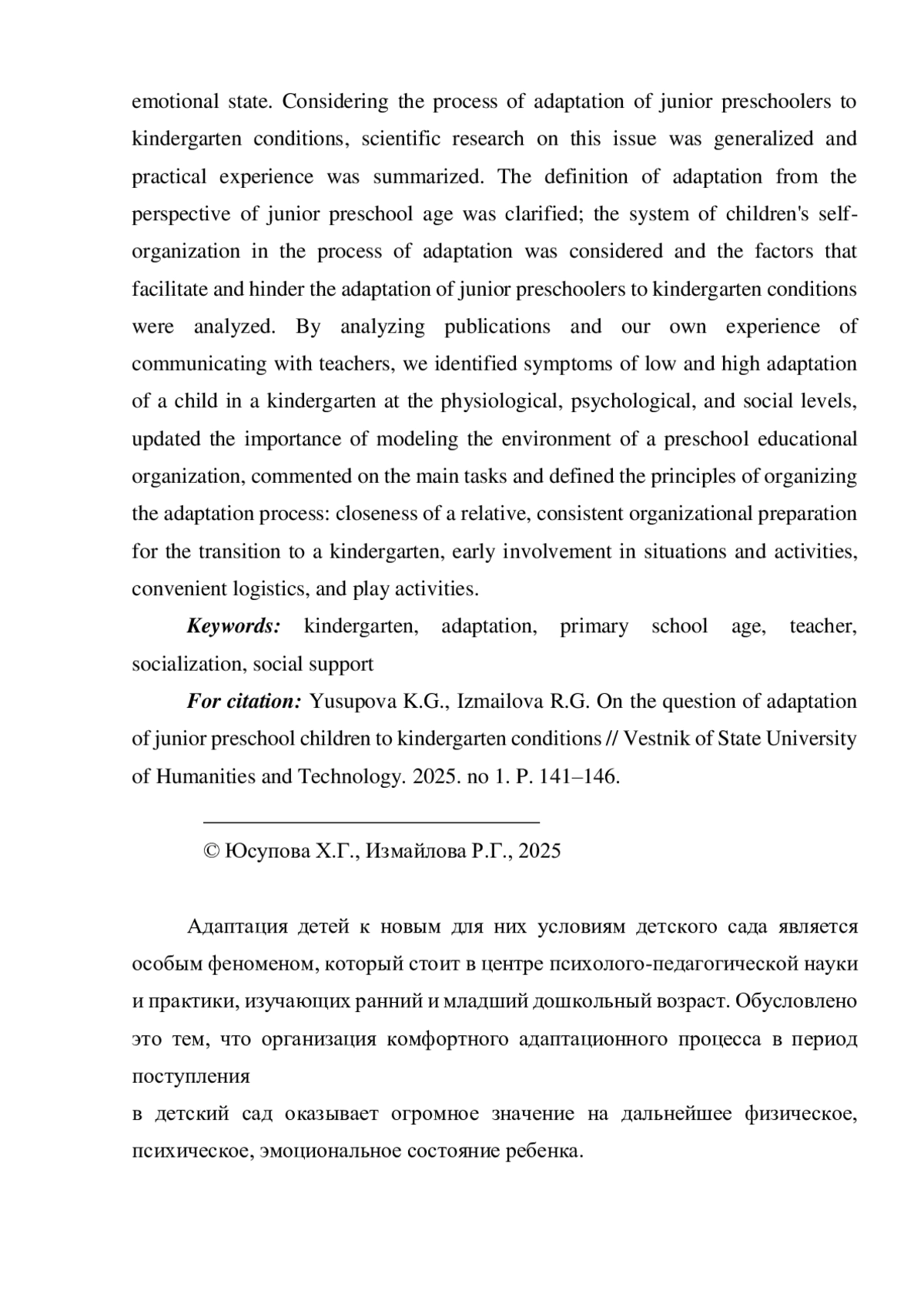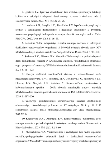 2. Баратилова Ю.А. Социально-психологическая адаптация детей к условиям дошкольной образовательной организации // Научные дискуссии в эпоху цифровизации: теории и практики: материалы IX Всероссийской научно-практической конференции. Краснодар, 2024. С. 62-65. EDN: JOZMMM