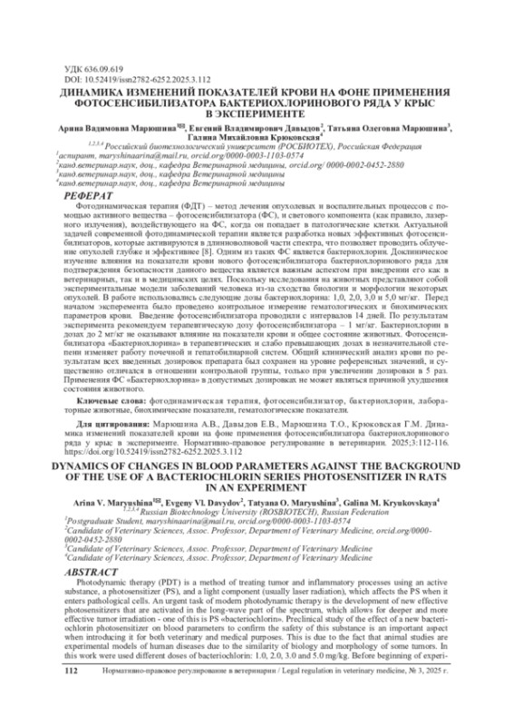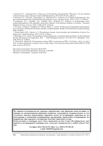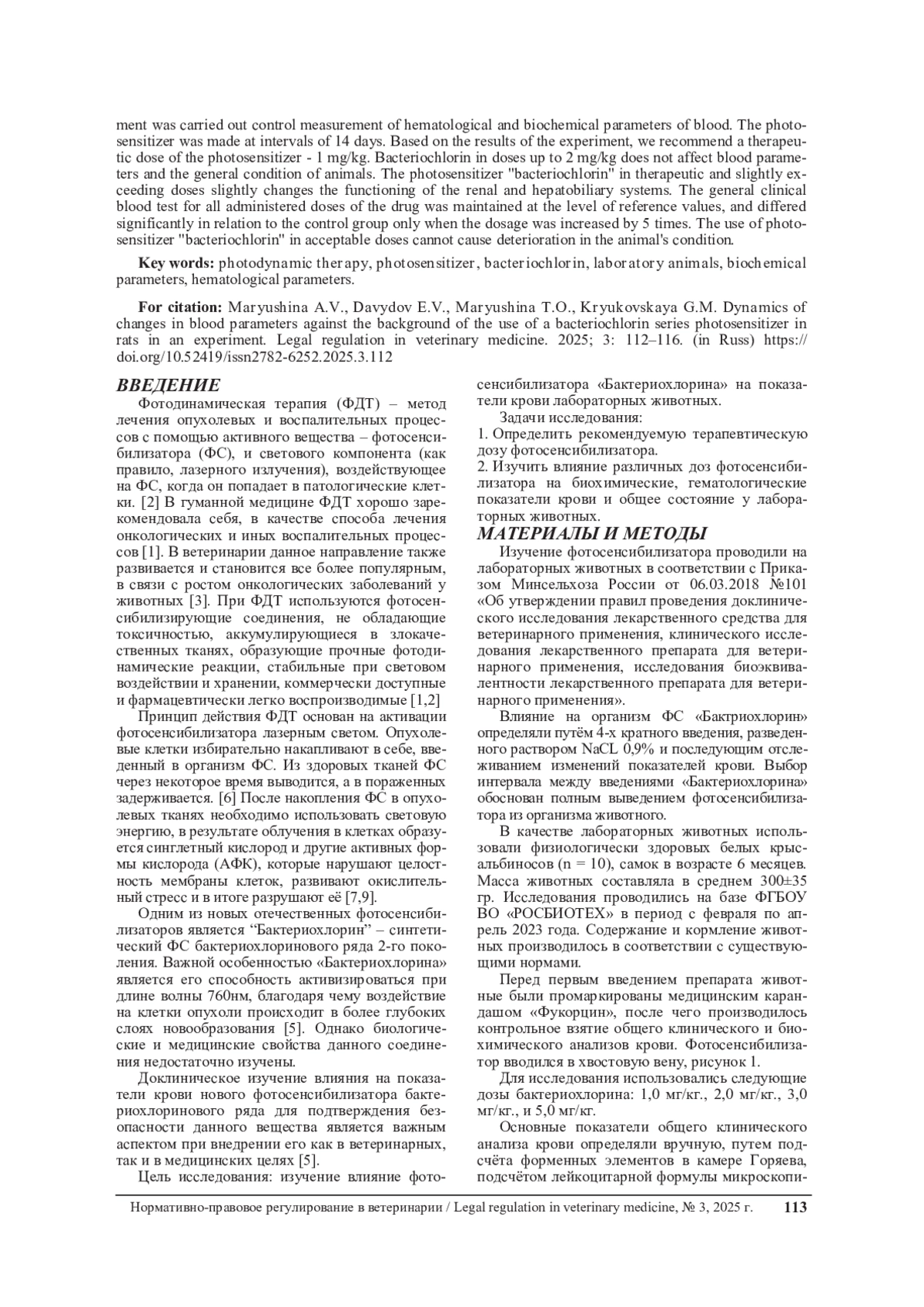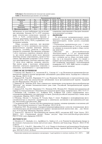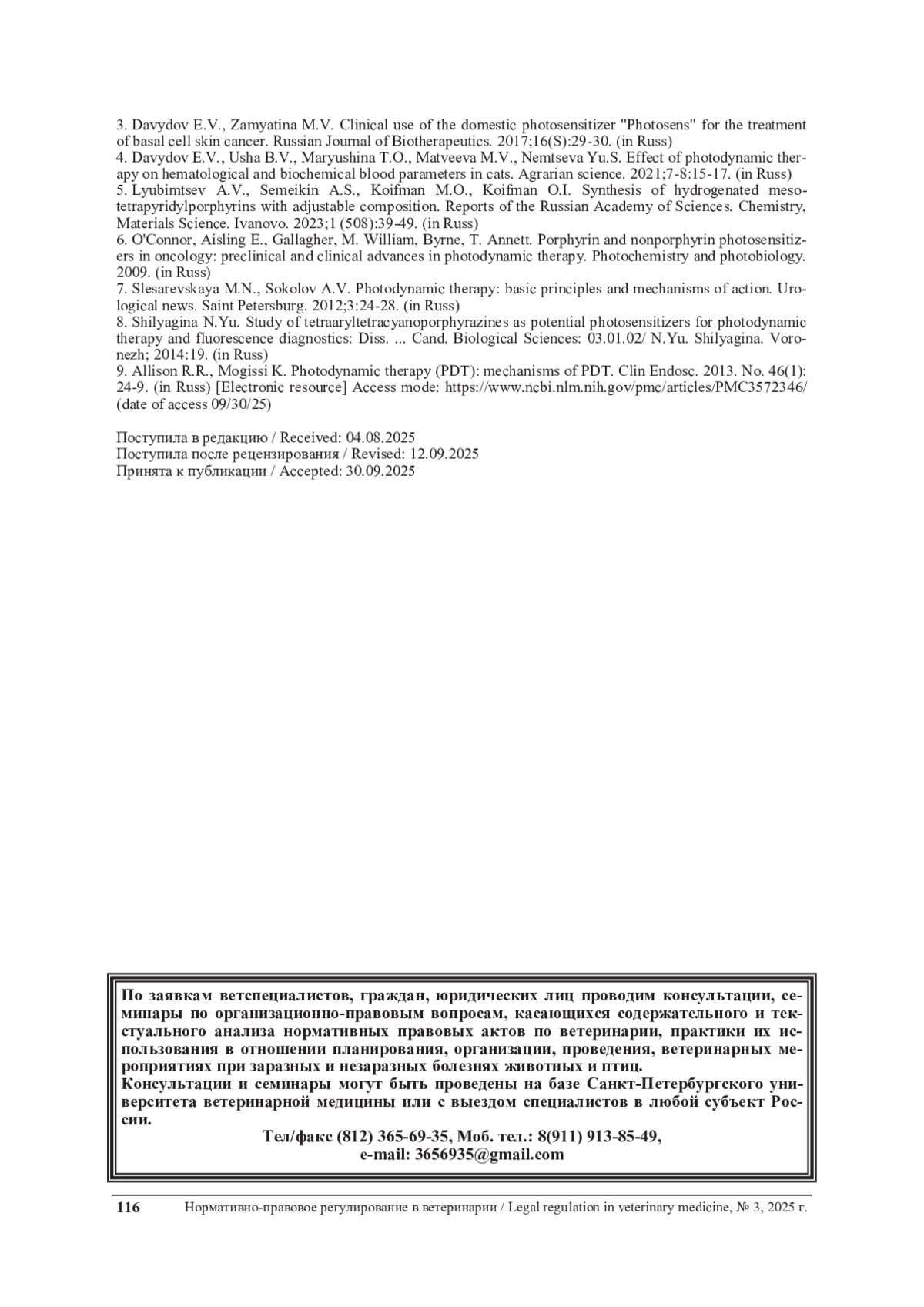 4. Давыдов Е.В., Уша Б.В., Марюшина Т.О., Матвеева М.В., Немцева Ю.С. Влияние фотодинамической терапии на гематологические и биохимические показатели крови кошек. Аграрная наука. 2021;7-8:15-17. EDN: FVIREZ