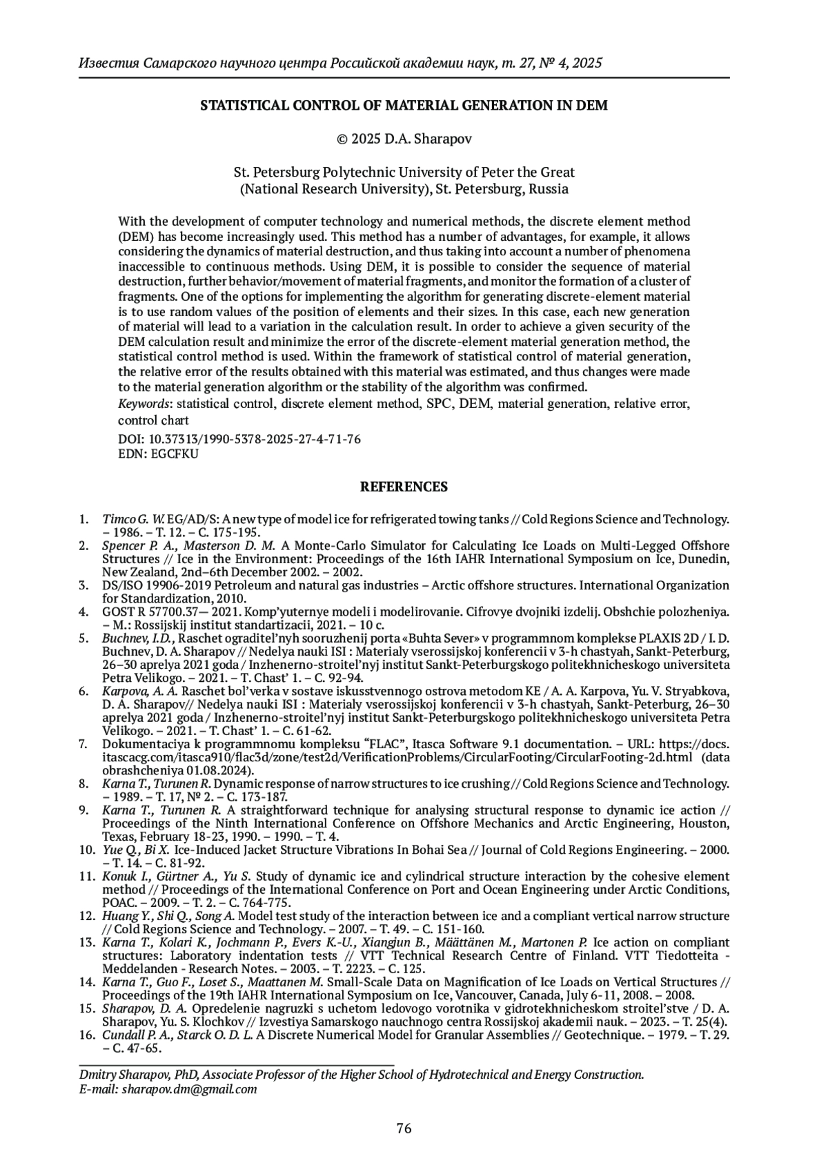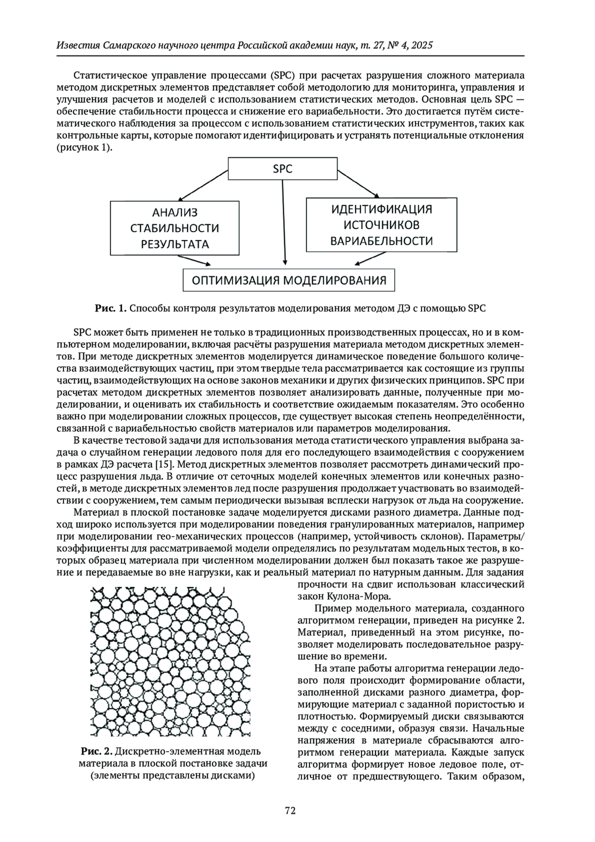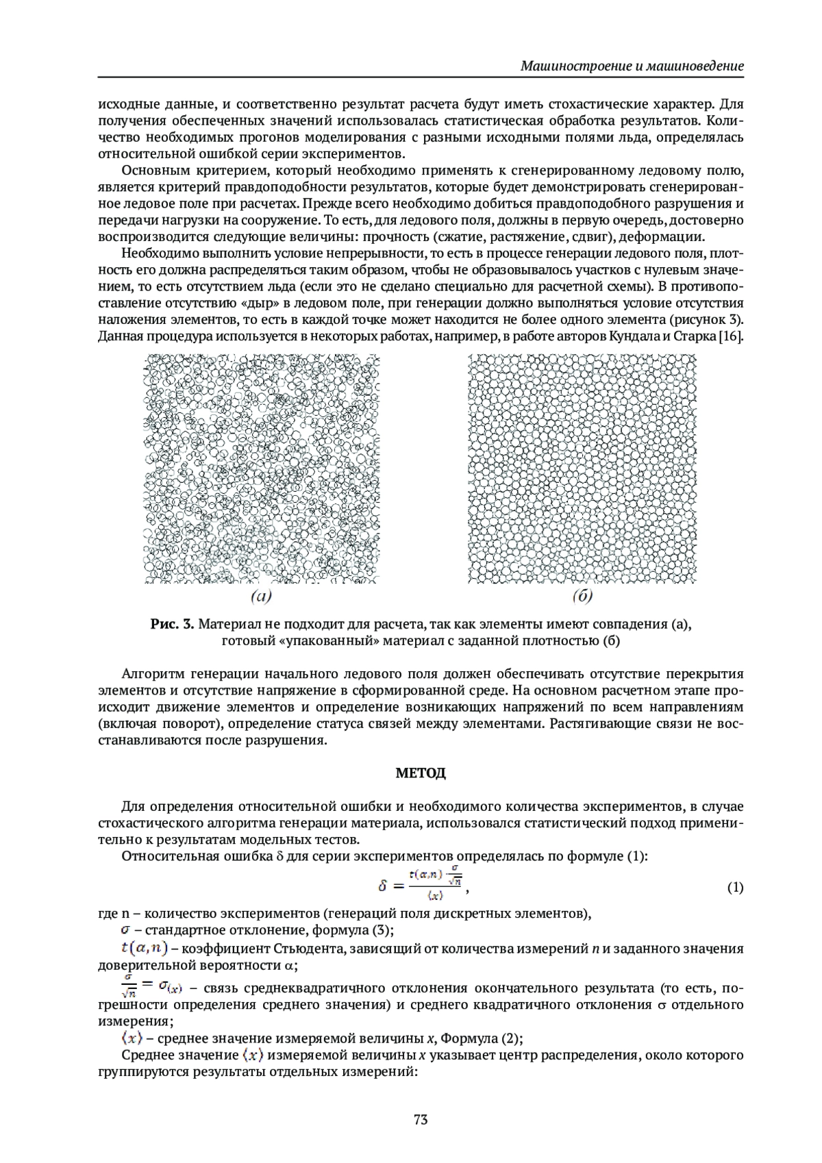 С развитием вычислительной техники и численных методов все больше применение находит метод дискретных элементов (МДЭ). Данный метод имеет ряд преимуществ, например, он позволяет рассматривать динамику разрушения материала, и, таким образом, учитывать ряд явлений недоступных континуальным методам. С помощью МДЭ возможно рассмотрение последовательности разрушения материала, дальнейшее поведение/движение обломков материала, мониторинг образования скопления обломков. Одним из вариантов реализации алгоритма генерации дискретно-элементного материала является использование случайных значений положения элементов и их размеров. При этом каждая новая генерация материала будет приводить к вариации результата расчета. Чтобы добиться заданной обеспеченности результата расчета МДЭ и свести к минимуму ошибку метода генерации дискретно-элементного материала (или генерация пространства данных), применяется метод статистического управления. В рамках статистического управления генерацией материала (или генерации пространства данных) оценивалась относительная ошибка результатов, полученных с этим материалом, и таким образом вносились изменения в алгоритм генерации материала или подтверждалась стабильность работы алгоритма.