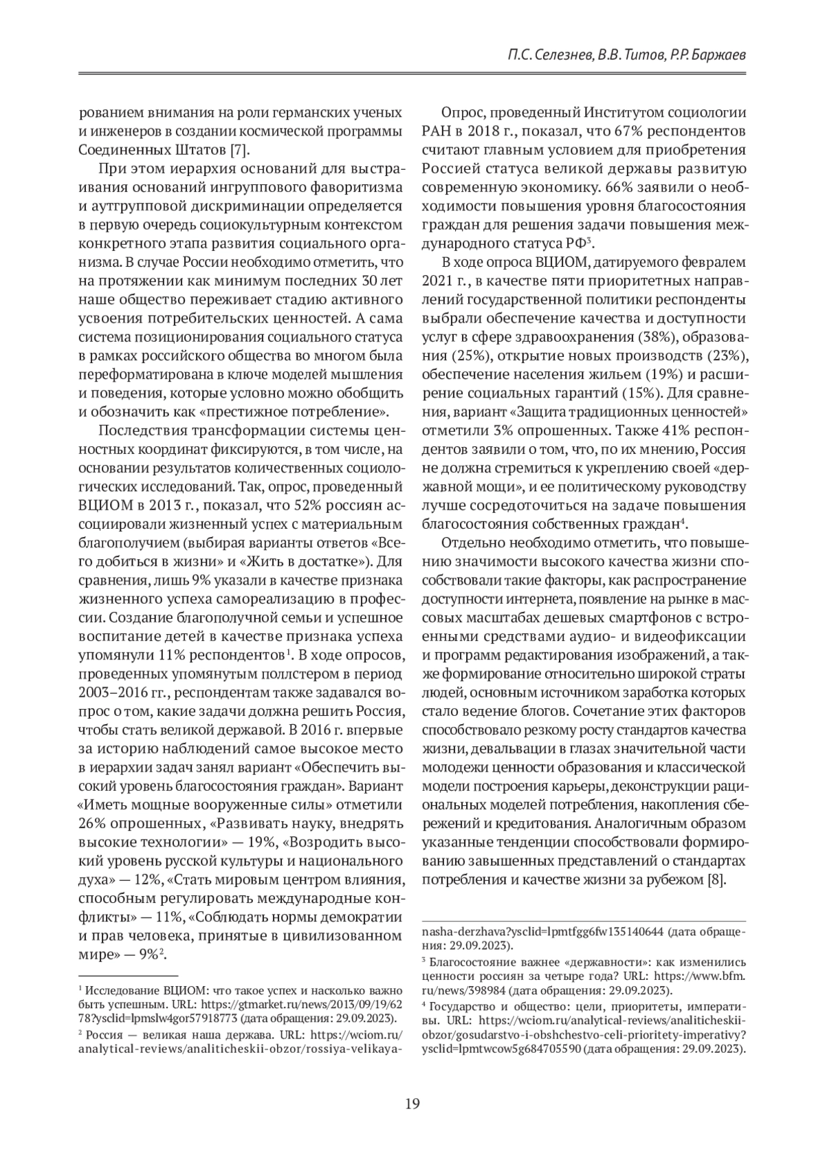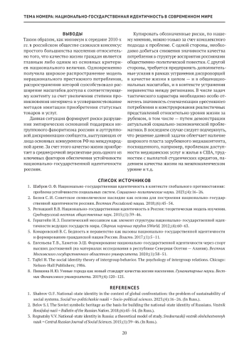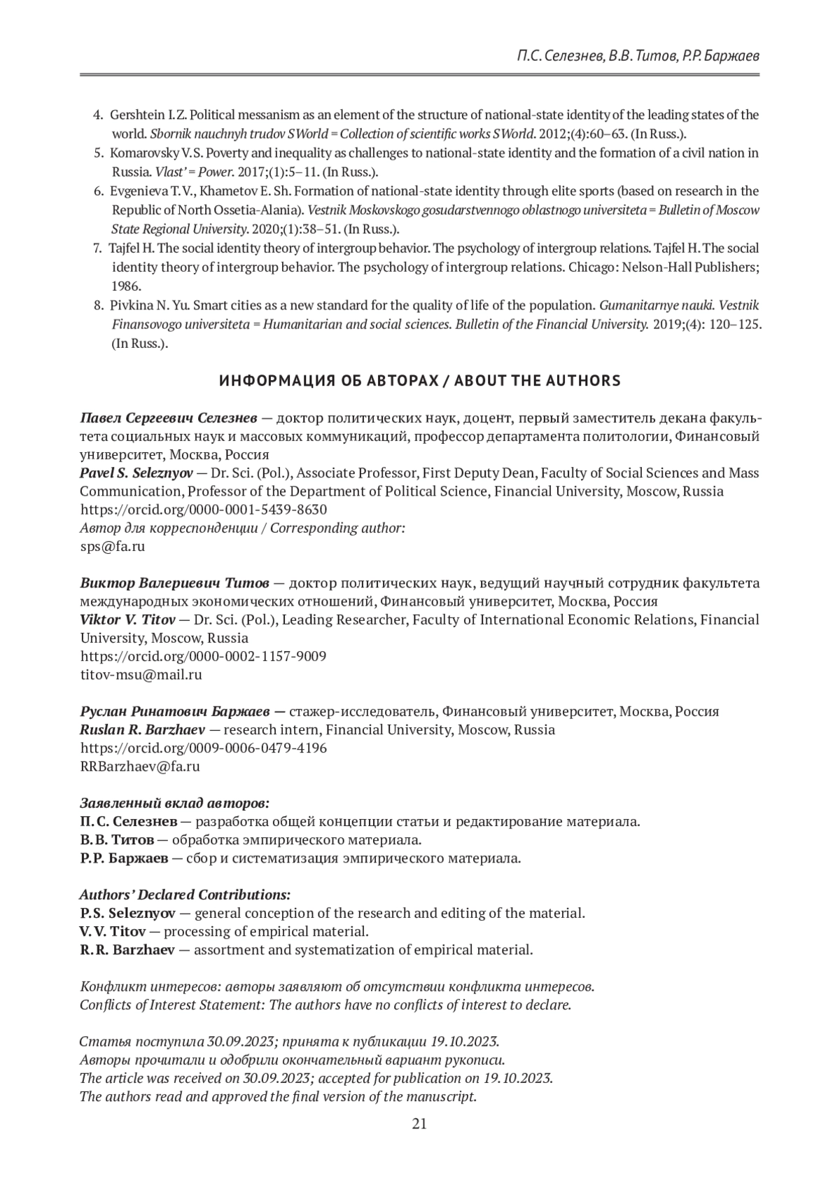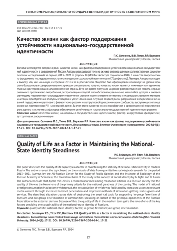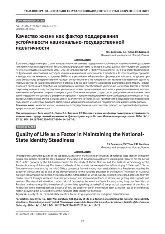 ТИТОВ В. В., БАРЖАЕВ Р. Р., СЕЛЕЗНЕВ П. С. КАЧЕСТВО ЖИЗНИ КАК ФАКТОР ПОДДЕРЖАНИЯ УСТОЙЧИВОСТИ НАЦИОНАЛЬНО-ГОСУДАРСТВЕННОЙ ИДЕНТИЧНОСТИ // ГУМАНИТАРНЫЕ НАУКИ. ВЕСТНИК ФИНАНСОВОГО УНИВЕРСИТЕТА. 2024. ТОМ 14, № 1