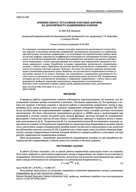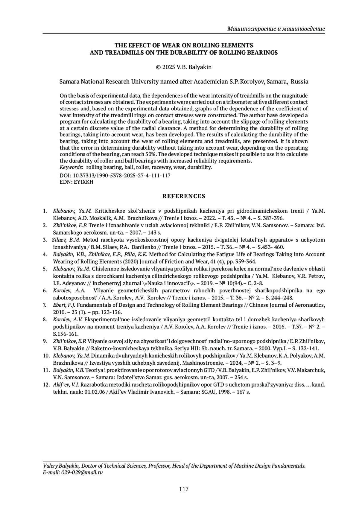 4. Balyakin, V.B., Zhilnikov, E.P., Pilla, K.K. Method for Calculating the Fatigue Life of Bearings Taking into Account Wearing of Rolling Elements (2020) Journal of Friction and Wear, 41 (4), pp. 359-364.