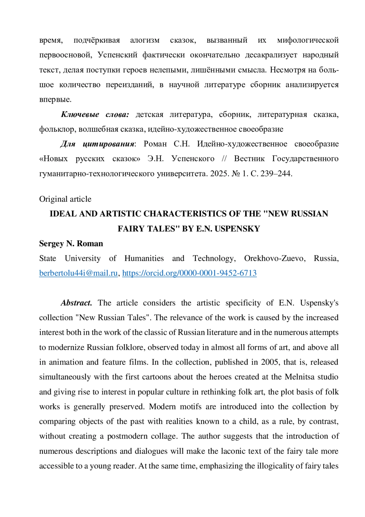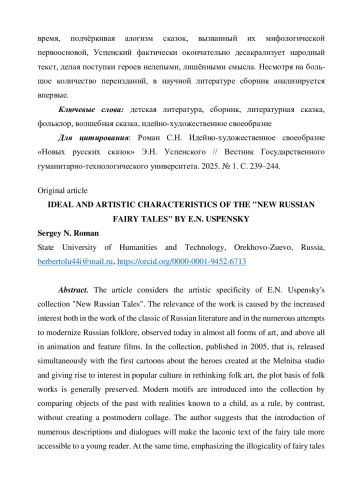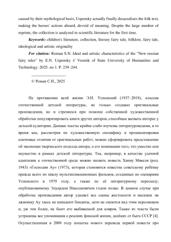 7. Роман С.Н. Идейно-художественное своеобразие повести Э.Н. Успенского “Вниз по волшебной реке” // Вестник Государственного гуманитарно-технологического университета. 2022. № 1. С. 167-172. EDN: VGGMJQ