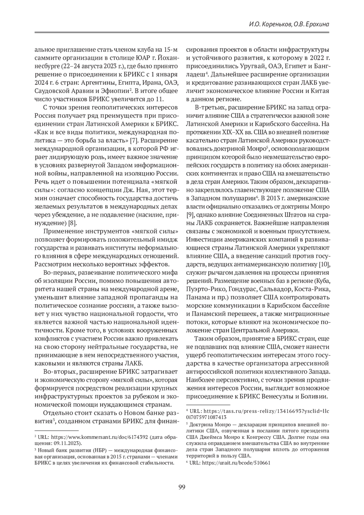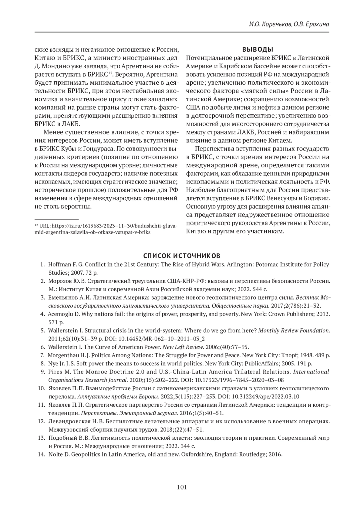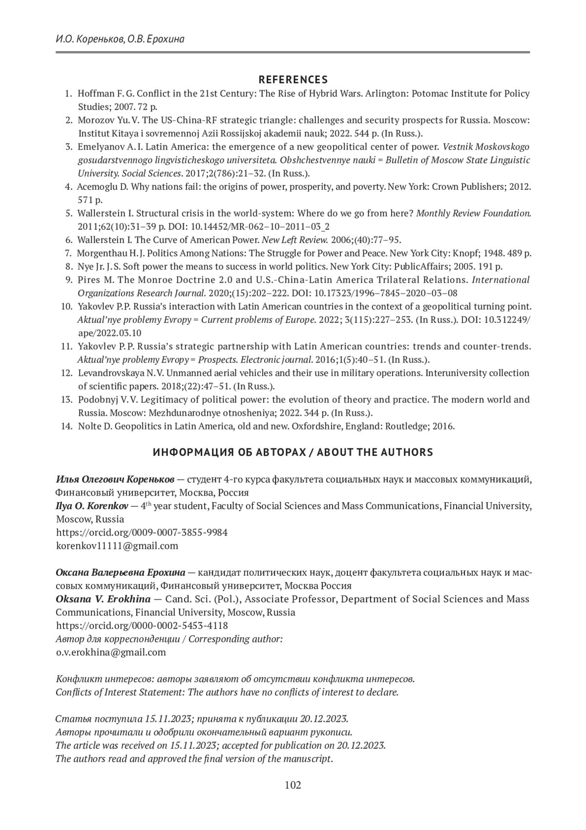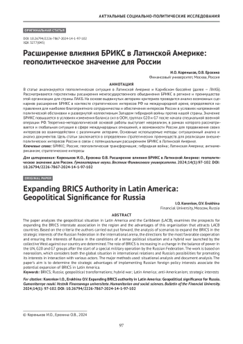 КОРЕНЬКОВ И. О., ЕРОХИНА О. В. РАСШИРЕНИЕ ВЛИЯНИЯ БРИКС В ЛАТИНСКОЙ АМЕРИКЕ: ГЕОПОЛИТИЧЕСКОЕ ЗНАЧЕНИЕ ДЛЯ РОССИИ // ГУМАНИТАРНЫЕ НАУКИ. ВЕСТНИК ФИНАНСОВОГО УНИВЕРСИТЕТА. 2024. ТОМ 14, № 1