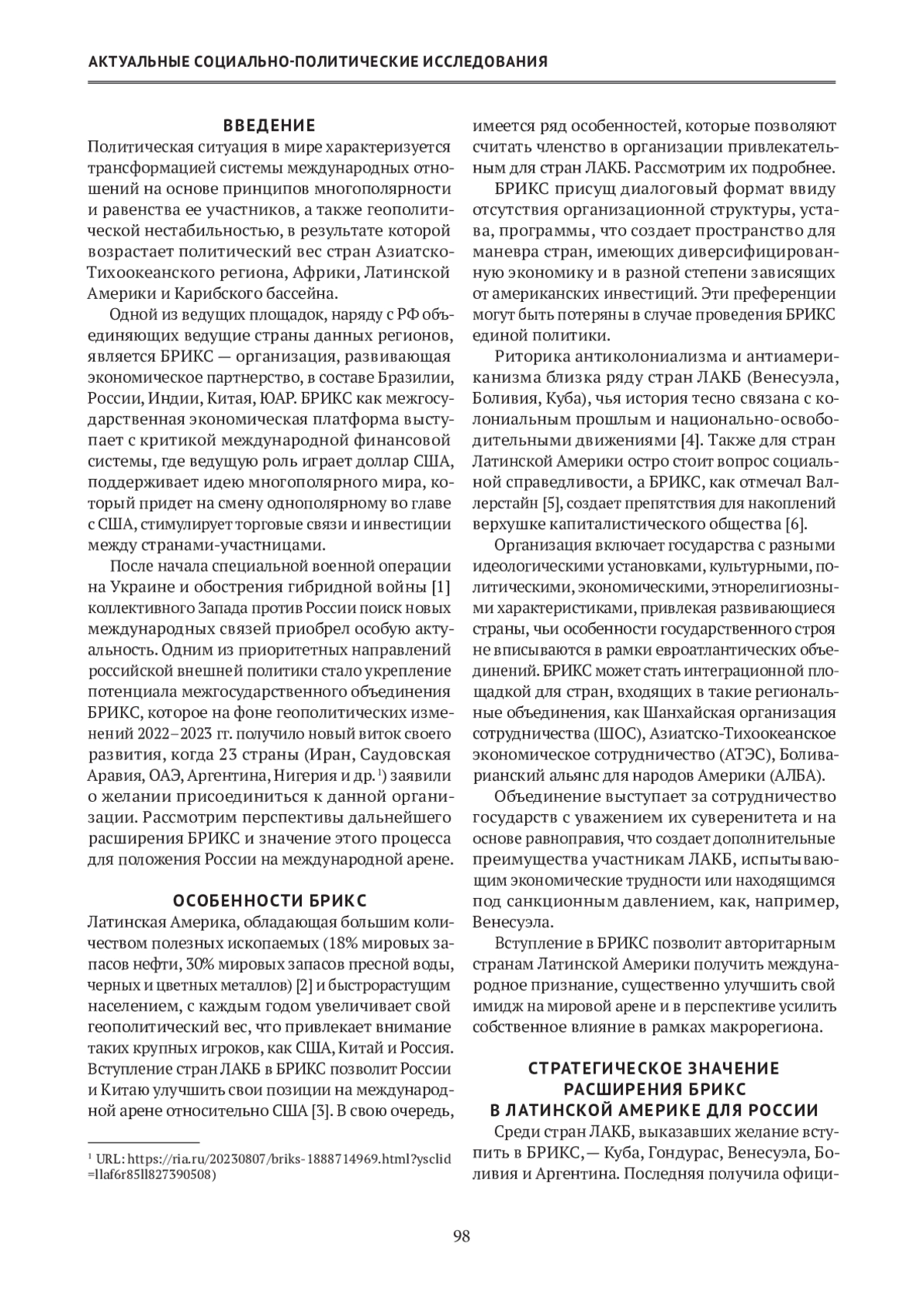 Статья: Расширение влияния БРИКС в Латинской Америке: геополитическое значение для России (2024)