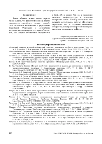 15. Торкунов А. В., Стрельцов Д. В., Колдунова Е. В. Российский поворот на Восток: достижения, проблемы и перспективы // Полис. 2020. № 5. С. 8-21. ;. DOI: 10.17976/jpps/2020.05.02 EDN: DBKKFU