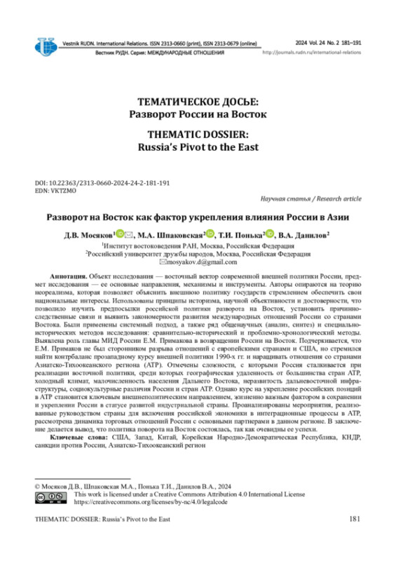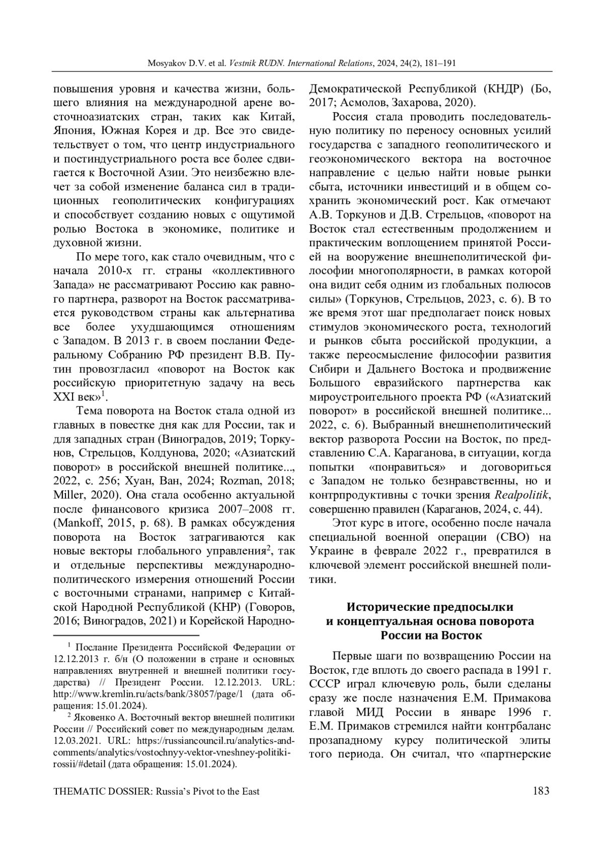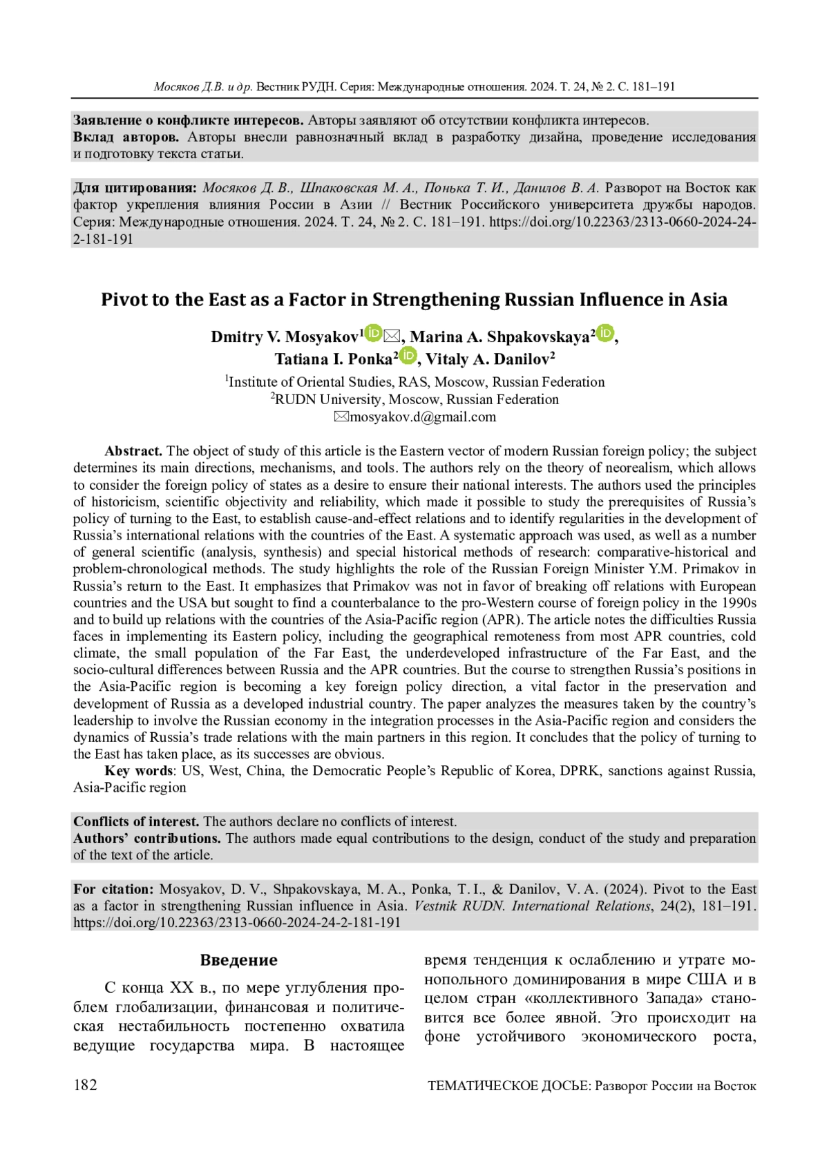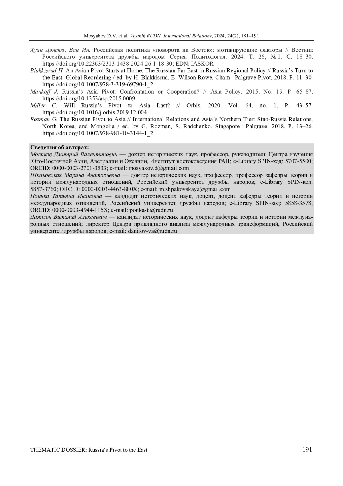 16. Хуан Дэнсюэ, Ван Ин. Российская политика “поворота на Восток”: мотивирующие факторы // Вестник Российского университета дружбы народов. Серия: Политология. 2024. Т. 26, № 1. С. 18-30. ;. DOI: 10.22363/2313-1438-2024-26-1-18-30 EDN: IASKOR