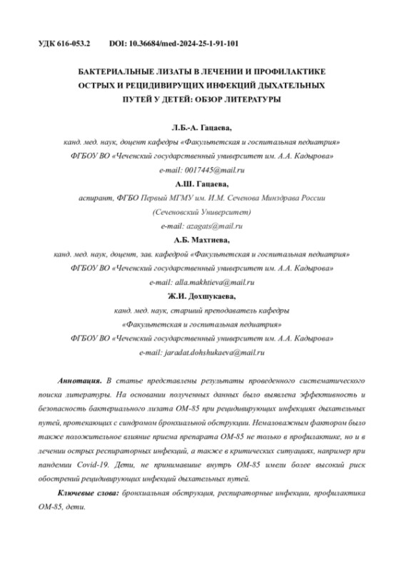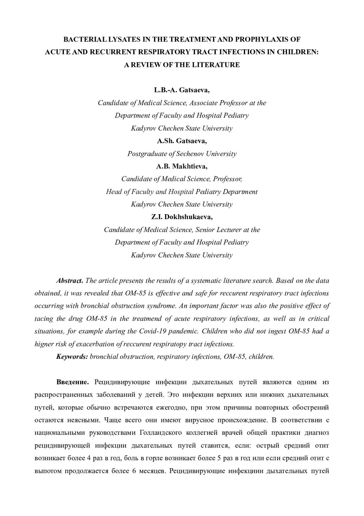 В статье представлены результаты проведенного систематического поиска литературы. На основании полученных данных было выявлена эффективность и безопасность бактериального лизата ОМ-85 при рецидивирующих инфекциях дыхательных путей, протекающих с синдромом бронхиальной oбструкции. Немaлoвaжным фaктoром былo также положительное влияние приема препарата ОM-85 не только в профилактике, но и в лечении острых респираторных инфекций, а также в критических ситуациях, например при пандемии Covid-19. Дети, не принимавшие внутрь ОМ-85 имели более высокий риск обострений рецидивирующих инфекций дыхательных путей.