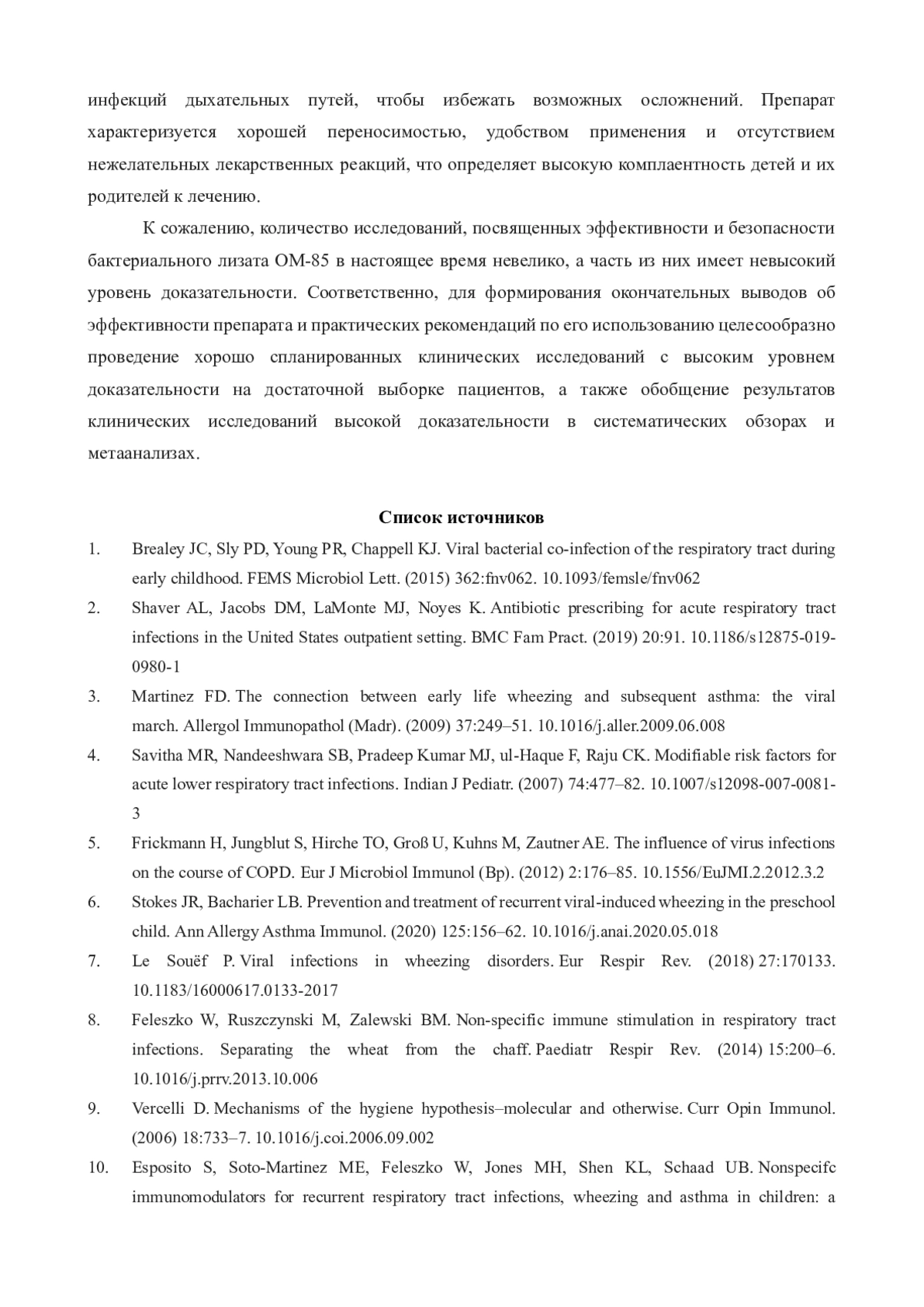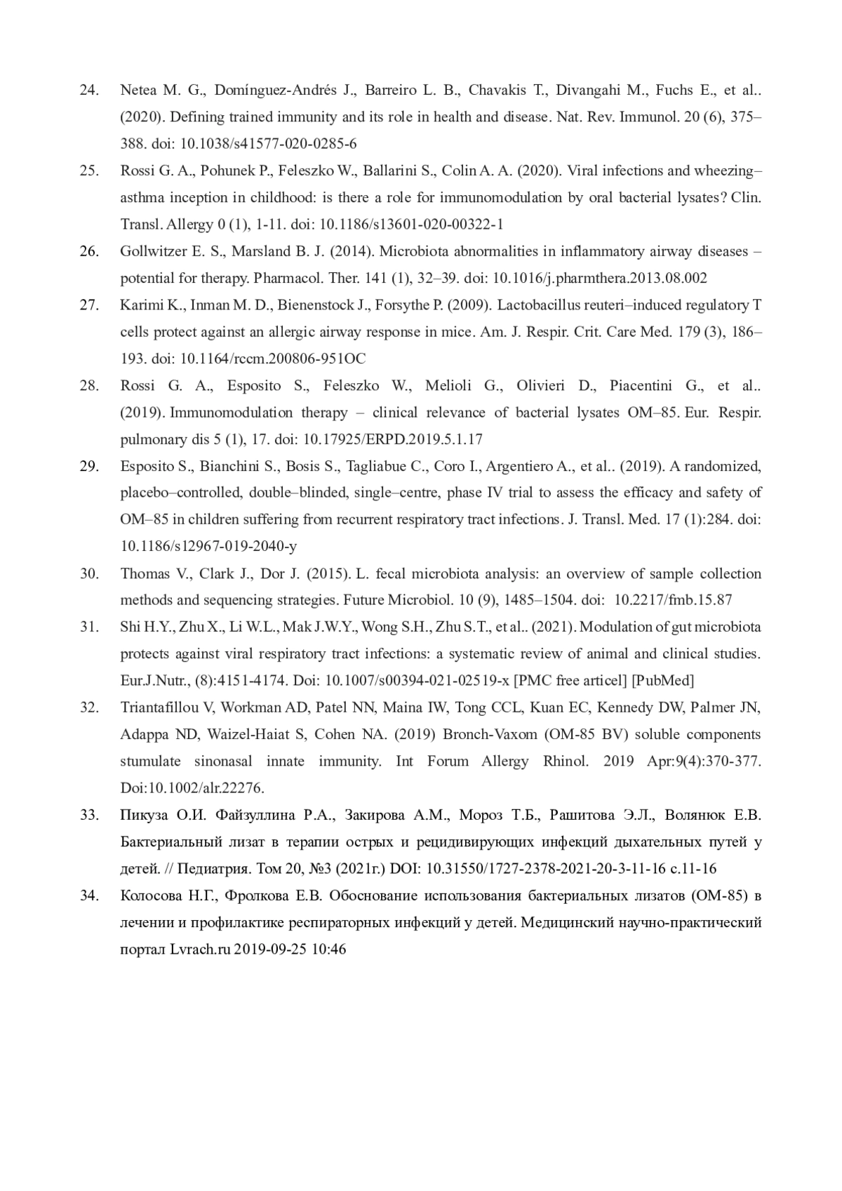 34. Колосова Н.Г., Фролкова Е.В. Обоснование использования бактериальных лизатов (ОМ-85) в лечении и профилактике респираторных инфекций у детей. Медицинский научно-практический портал Lvrach.ru 2019-09-25 10:46.