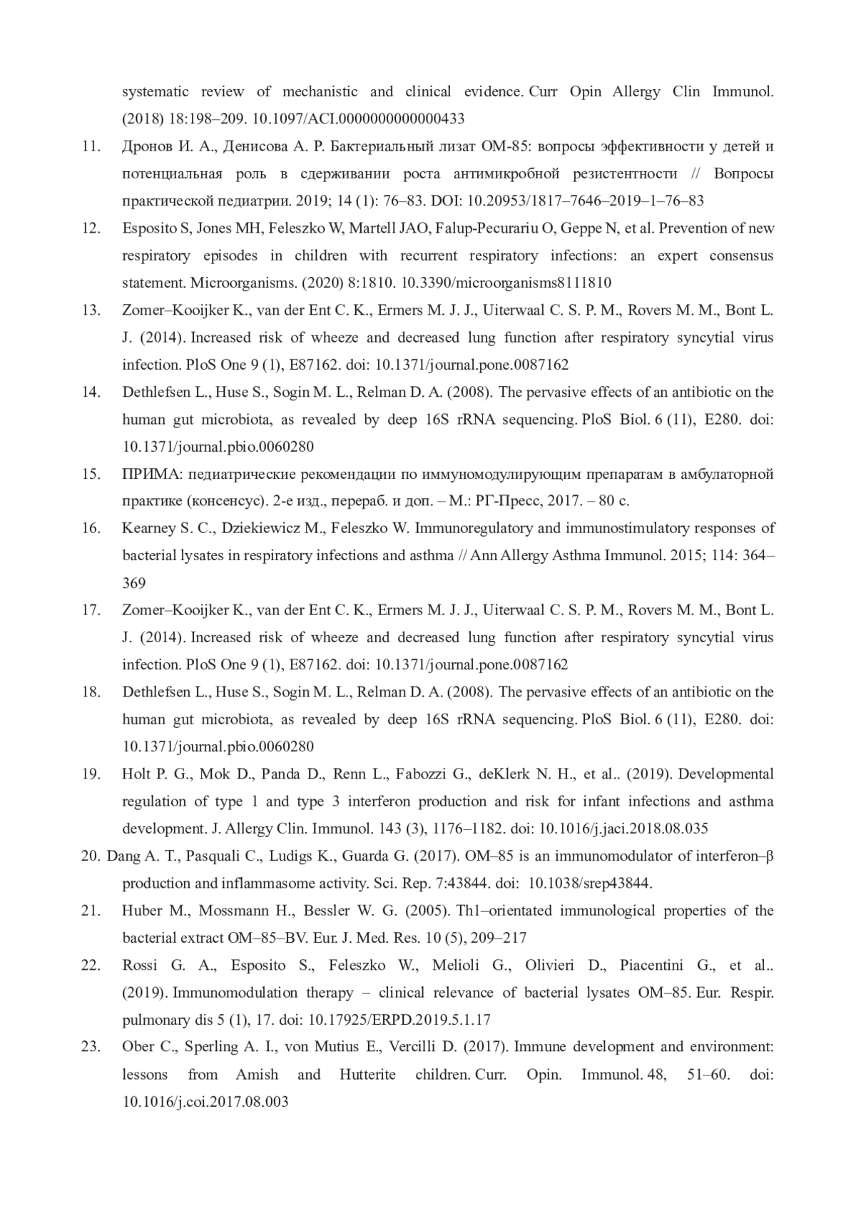 11. Дронов И. А., Денисова А. Р. Бактериальный лизат ОМ-85: вопросы эффективности у детей и потенциальная роль в сдерживании роста антимикробной резистентности // Вопросы практической педиатрии. 2019; 14 (1): 76-83. DOI: 10.20953/1817-7646-2019-1-76-83 EDN: QXGMFS