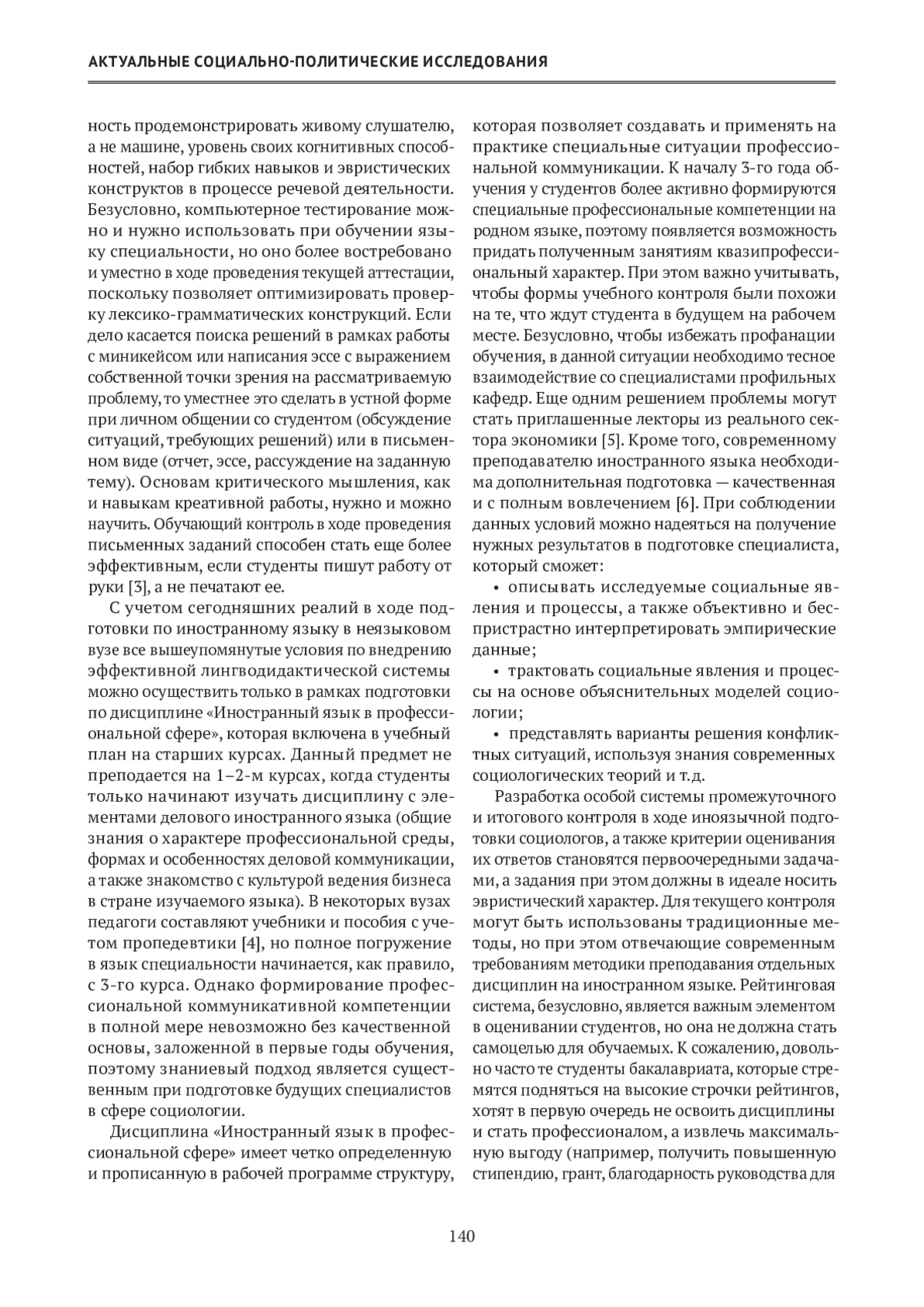 В статье рассматриваются цели обучения языку специальности, а также роль и функции контроля при их реализации. Анализируются условия, нужные для качественного проведения контроля учебных достижений в ходе освоения дисциплины «Иностранный язык в профессиональной сфере» студентами бакалавриата по направлению подготовки «Социология». Доказывается необходимость модернизации методов контроля, при помощи которых можно не только проверять у студентов уровень сформированности различных компетенций, согласно ФГОС ВО, но одновременно с этим развивать у них навыки критического и креативного мышления. Предлагаются рекомендации по взаимодействию со специалистами профильных кафедр и приглашенными лекторами из реального сектора экономики, а также по организации дополнительной профессиональной подготовки для преподавателей, которые обучают будущих социологов языку специальности.