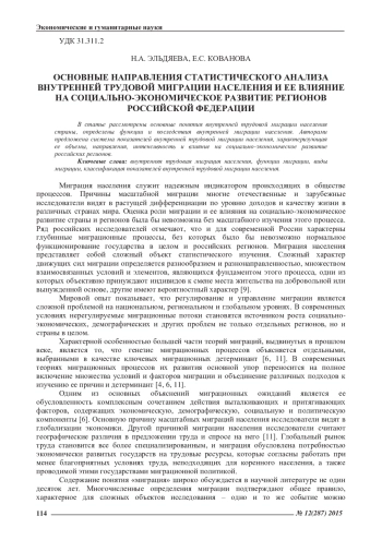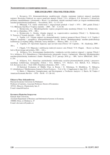 1. Кованова, Е.С. Эконометрическое моделирование влияния внутренней трудовой миграции населения регионов Российской Федерации на основе панельных данных [Текст] / Н.А. Эльдяева, Е.С. Кованова // Актуальные проблемы менеджмента и экономики в России и за рубежом: сборник научных трудов по итогам международной научно-практической конференции. - Новосибирск, 2015. - С. 133-135. EDN: TNQZJH