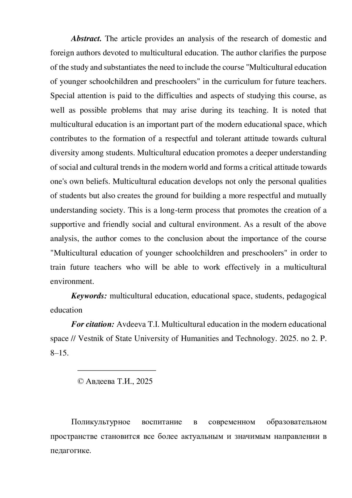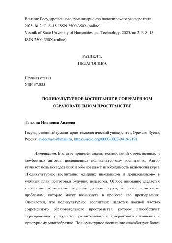 АВДЕЕВА Т. И. ПОЛИКУЛЬТУРНОЕ ВОСПИТАНИЕ В СОВРЕМЕННОМ ОБРАЗОВАТЕЛЬНОМ ПРОСТРАНСТВЕ // ВЕСТНИК ГОСУДАРСТВЕННОГО ГУМАНИТАРНО-ТЕХНОЛОГИЧЕСКОГО УНИВЕРСИТЕТА. 2025. № 2